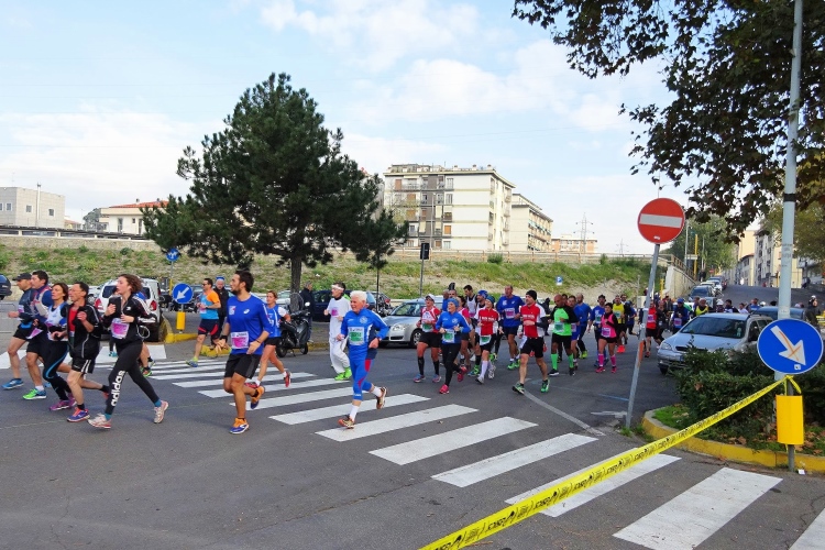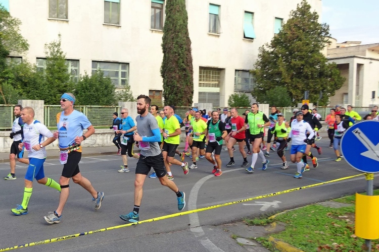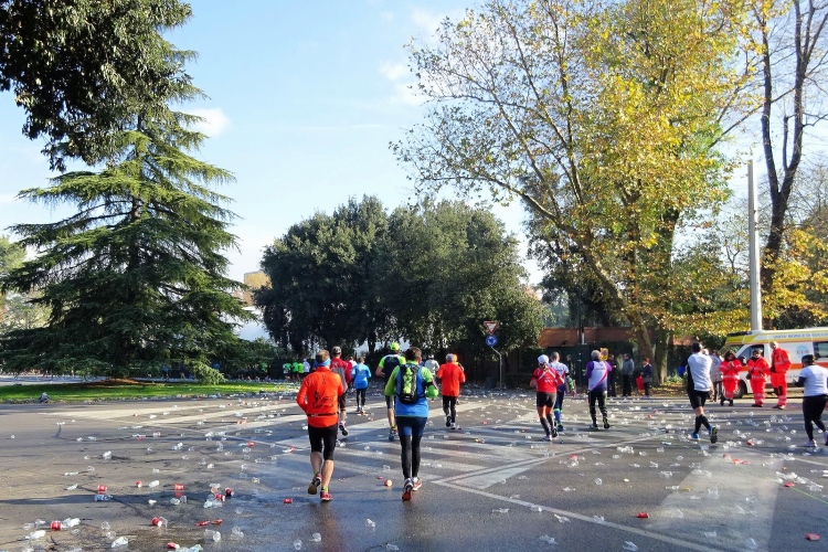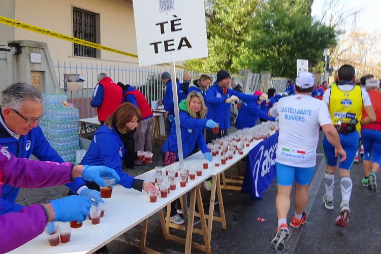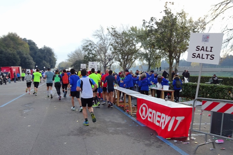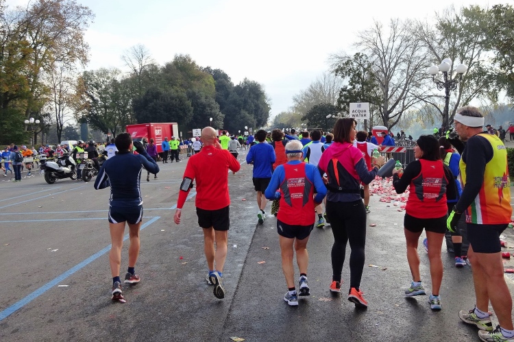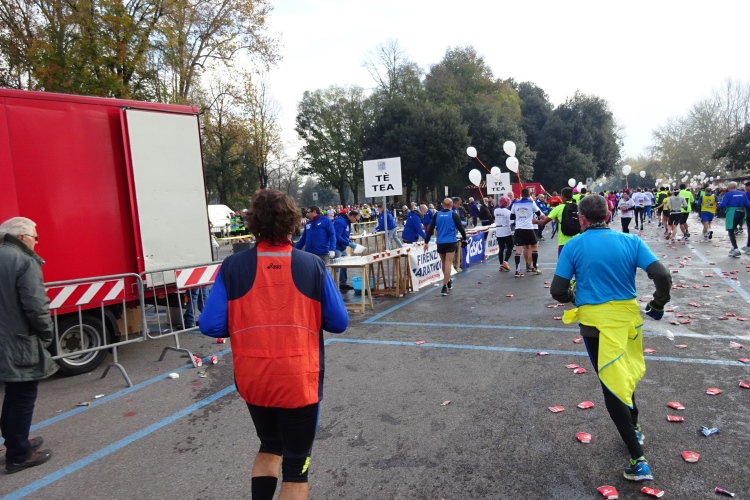 Der Kurs führt nun durch eine Seitenstraße ins Wohngebiet, Zuschauer sehe ich kaum. Ein älterer Mann wartet ab, bis er sein Klapperfahrrad auf die andere Straßenseite schieben kann. Die erste von insgesamt acht Labestationen (alle 5 Kilometer wie üblich) befindet sich auf der via B. Marcello. Es gibt warmen Tee, Iso, Wasser und Kekse. Die Pacer bleiben nicht stehen, ich schon und renne der Gruppe nach. Es ist den Organisatoren hoch anzurechnen, bei den niedrigen Temperaturen warmen Tee anzubieten. Mal sehen, ob er an den folgenden Versorgungsstellen nicht abgekühlt sein wird.