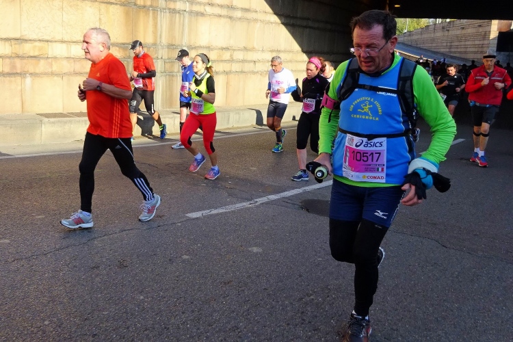 Ein kleiner Prüfstein für die Tempobolzer wird die auf uns zukommende Unterführung bei der Piazza Bambini di Beslan. Auf der Brücke oben stehen einige Zuschauer, eine spanische Fahne ist aufgespannt. Für mich überraschend ist, dass kein einziger vor mir liegender Läufer beim kurzen Anstieg nach der Unterführung zurückfällt – die Kollegen nehmen den Schwung mit. Da ich 20 Meter vor den 4:30er-Gruppe liege, nehme ich Tempo raus und bleibe zum Knipsen auch kurz stehen – so verwackeln die Bilder nicht.