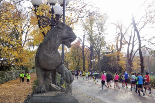 Am Ende unserer Schleifen im Park sehe ich in der Ferne kurz die Kuppel des Doms, dann lenken mich einige Rennradler ab, die uns überholen. Als wir nach links auf einen Nebenweg abbiegen, sind sie mit dabei. Anscheinend stört das nur einen, nämlich mich. Italienische Läufer sind sehr radlerfreundlich. Erst nach der 15-km-Verpflegungsstelle werden die ciclisti von einem Polizisten mit köstlich aussehendem klassischem weißem Helm aus dem Verkehr gezogen.