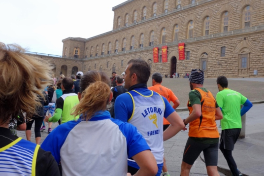 Aber erst mal genießen wir den Blick auf die Skyline am Arno, bevor es in ein enges Sträßchen geht. Wunderbar romantisch. Vor uns das große Stadttor Porta Romana. Der Weihnachtsschmuck über der Straße leuchtet nachts in bunten Farben. Spitzkehre und dann rechts auf einmal die Münchner Residenz. Da liegt natürlich eine Verwechslung vor: In Wirklichkeit handelt es sich um den Palazzo Pitti, der als Vorbild für das Bauwerk in der bayerischen Landeshauptstadt diente. Dahinter die berühmte Gartenanlage Giardino di Boboli. Für mich sind das die stimmungsvollsten Kilometer des Laufs. Am Arno geht es an den Treppenanlagen vorbei, die hinauf zum Piazzale Michelangelo führen. Auf diesem „Aussichtsbalkon“ hoch über der Stadt wurde in früheren Jahren der Marathon gestartet. Leider werden wir bei unserem Aufenthalt diesmal keine Zeit haben, hinauf zu spazieren.