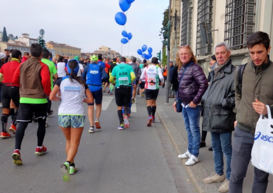 Musik wird auch geboten: von einer Kapelle im LKW und einer Kinderschar, die mit viel Inbrunst und nicht ganz klangrein Beethovens „Ode an die Freude“ zu Gehör bringt. Ich interpretiere das Abspielen der EU-Hymne als Aufforderung an die britischen Läufer, sich die Sache mit dem Brexit noch mal zu überlegen. Gerade als sich die Wolken lichten, bin ich am Arno und sehe die Sonnenstrahlen in einem Wasserfall glitzern. Einige Läufer vom LSD Küps 05 in Oberfranken haben ihre Wettkampfteilnahmen auf den Trikots verewigt. Ich bin gerade mit ihnen im Gespräch, als uns zwei Mitstreiter in Valencia-Laufhemden überholen. Denen rufe ich zu, dass ich am vergangenen Wochenende auch dabei war. Einer von ihnen ist Deutscher, lebt aber schon lange in Florenz.