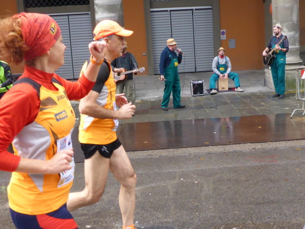 Wir sind nun im Wohngebiet. Viele Menschen stehen hier und klatschen Beifall. Die erste VP bei km 5 wird dankbar angenommen. Es gibt Tee, Wasser und Iso. Es folgt ein kurzes Begegnungsstück, eine scharfe Kurve und das Ganze auf der anderen Straßenseite wieder zurück. Wir kommen in den Parco delle Cascine. Am Eingang spielt eine Band und die Läufer klatschen und bedanken sich für die tolle Unterstützung.