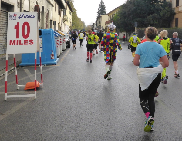 Bei km 8 bricht dann der Gegenverkehr links weg und wir haben die Straße für uns. Vor dem Gelände der Pferderennbahn werden Schwämme ausgeteilt. Super Idee. Es ist zwar nicht gerade heiß, aber was ich kühlen kann, muss ich schon nicht trinken. Die Straße macht eine Kurve und führt uns richtungsmäßig wieder zurück. Es geht am Ufer des Arno entlang. Ungefähr in der Mitte des Parks hinter km 10 liegt die nächste VP. Hier haben die Helfer alle Hände voll zu tun, denn auch von der anderen Seite kommen Läufer. Bei uns wird es hektisch. Drei Pacer für 4:30 kommen mit einer ganzen Meute von hinten. Ich gehe in Deckung und werde einfach mitgezogen. Das ist ja eigentlich nicht meine Welt, aber die Stimmung im Pulk ist wirklich toll. Gerade fragt ein Pacer, wer hier seinen ersten Marathon läuft. Nahezu die Hälfte meiner Mitläufer gibt Handzeichen. Sie bekommen Tipps und Ermutigungen.