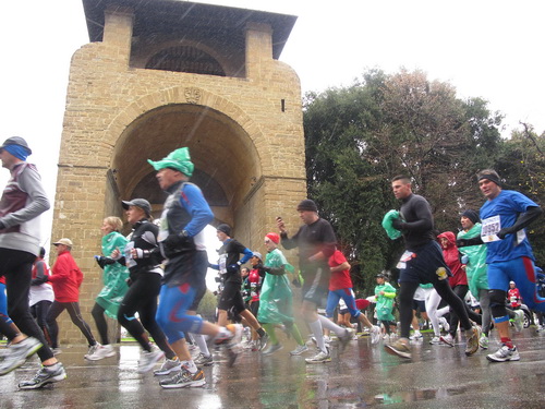Letztendlich erinnere ich mich aber daran, dass ich bei schlechtem Wetter und Kälte lieber als Läufer unterwegs bin, als mir als Fotograf an der Strecke den Allerwertesten abzufrieren. Also ziehe ich mir in der Früh über ein Kurz- und Langarmshirt die Regenjacke und darüber die vom Veranstalter spendierte Folie und gehe die zweihundert Meter vom Hotel Mediterraneo zu den Shuttlebussen, die die Läufer zur Piazzale Michelangiolo, der Aussichtsterrasse von Florenz bringen. Seinen Kleiderbeutel gibt man vorher ab, was heute nicht die beste Lösung ist.