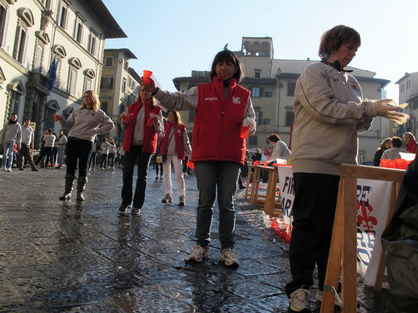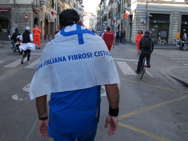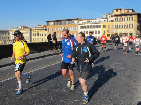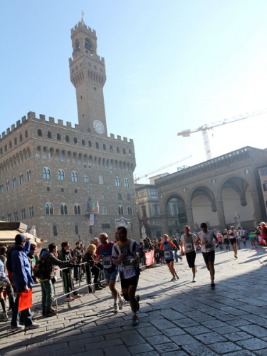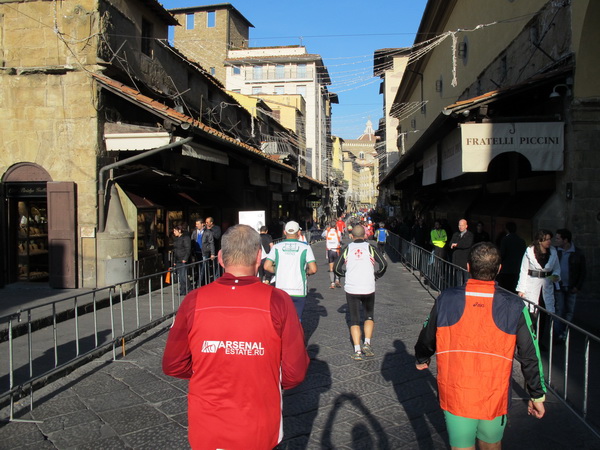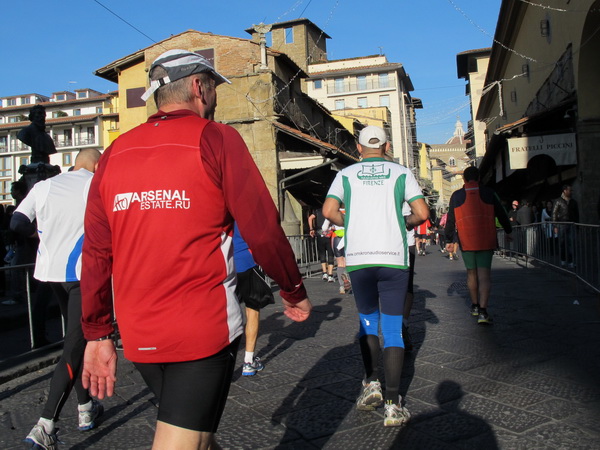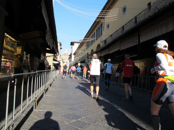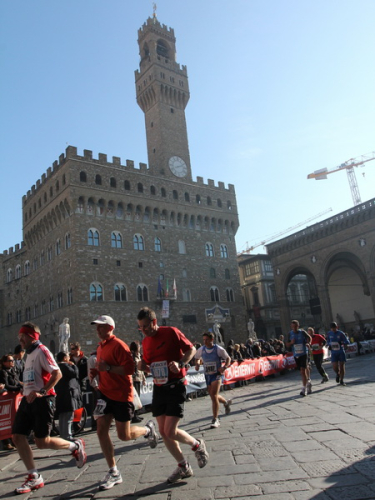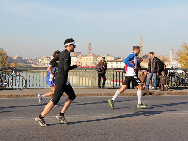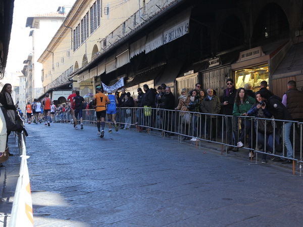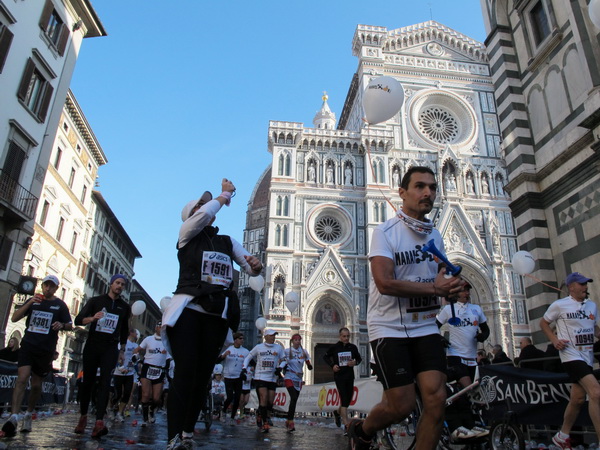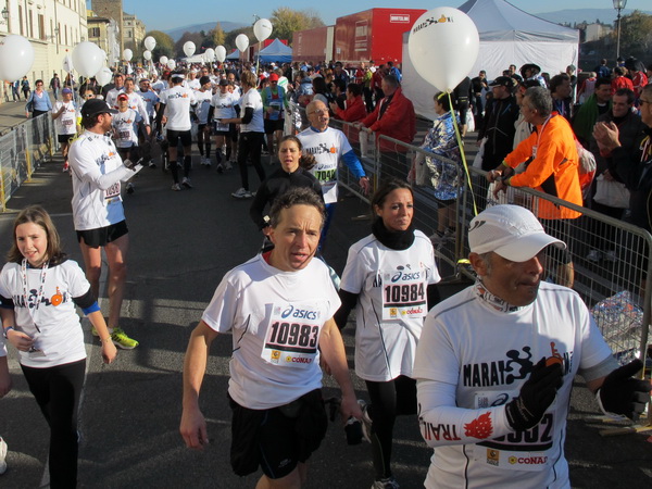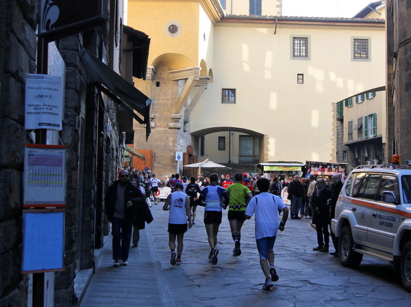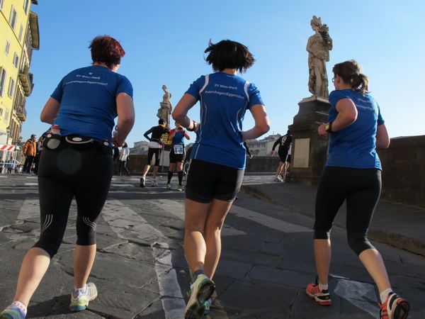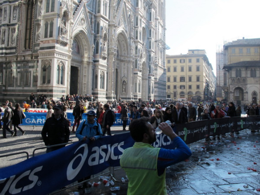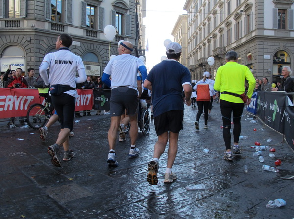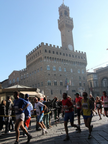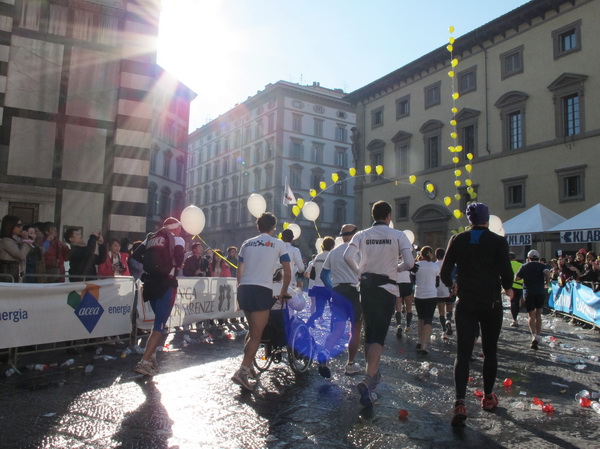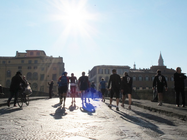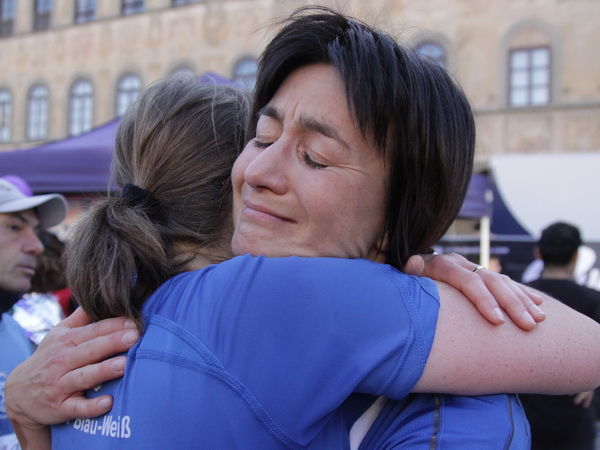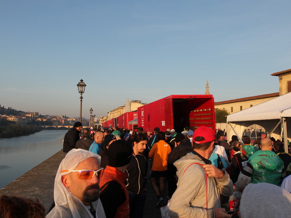 Durch eine schmale Gasse erreichen wir das Arno-Ufer, wo aufgereiht die roten LKW-Aufleger mit den Kleiderbeutel stehen. Hunderte Läuferinnen und Läufer ziehen sich dort um, als die Gruppe „Marathon Abili“ mit ihren behinderten Freunden auftaucht. Spontan versammeln sie sich an der Strecke und bereiten den wahren Helden dieses Laufes einen Empfang, dass es denen die Tränen die Augen treibt. Es ist für mich der schönste Moment des Tages.