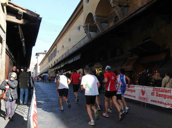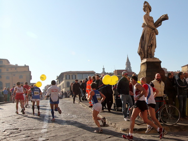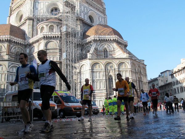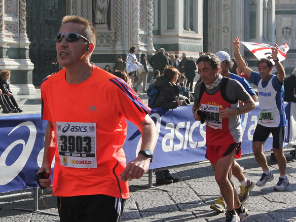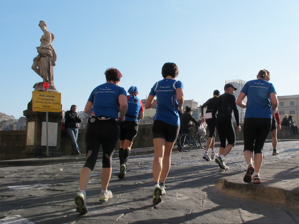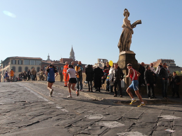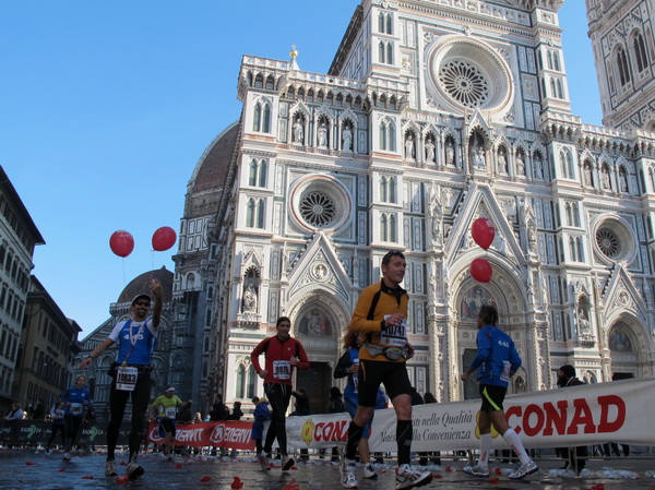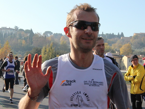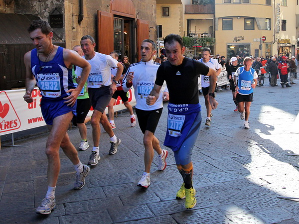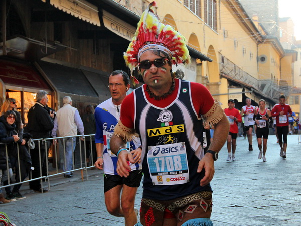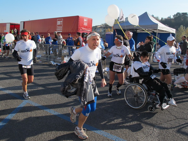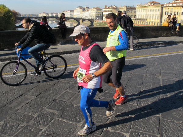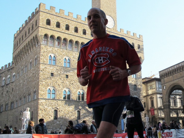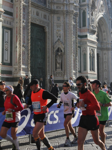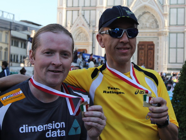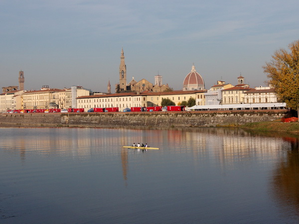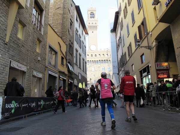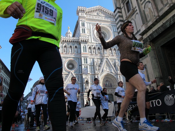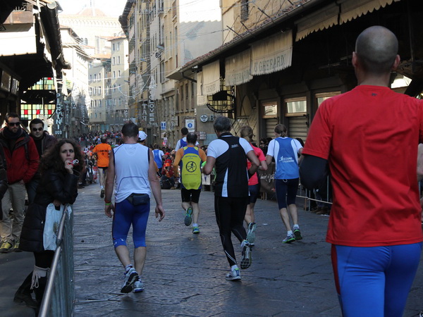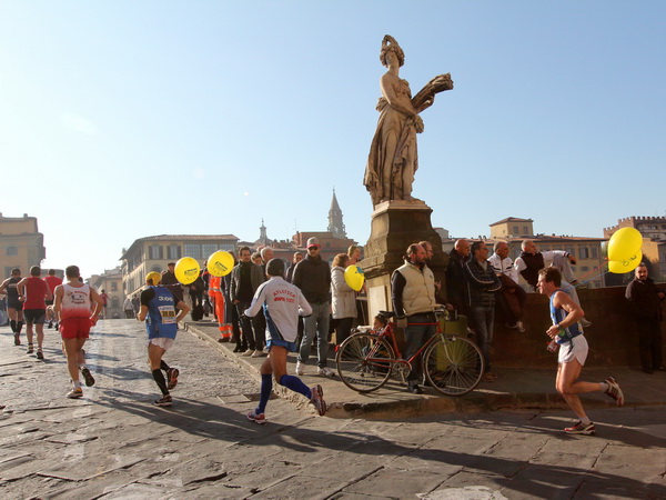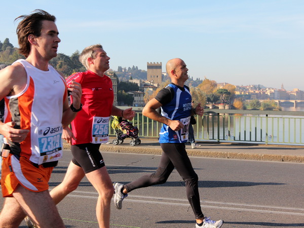 Durch eine schmale Gasse erreichen wir das Arno-Ufer, wo aufgereiht die roten LKW-Aufleger mit den Kleiderbeutel stehen. Hunderte Läuferinnen und Läufer ziehen sich dort um, als die Gruppe „Marathon Abili“ mit ihren behinderten Freunden auftaucht. Spontan versammeln sie sich an der Strecke und bereiten den wahren Helden dieses Laufes einen Empfang, dass es denen die Tränen die Augen treibt. Es ist für mich der schönste Moment des Tages.