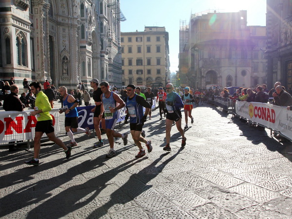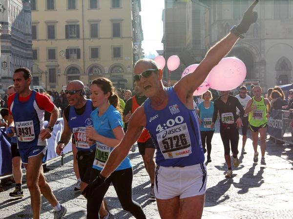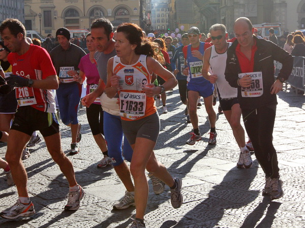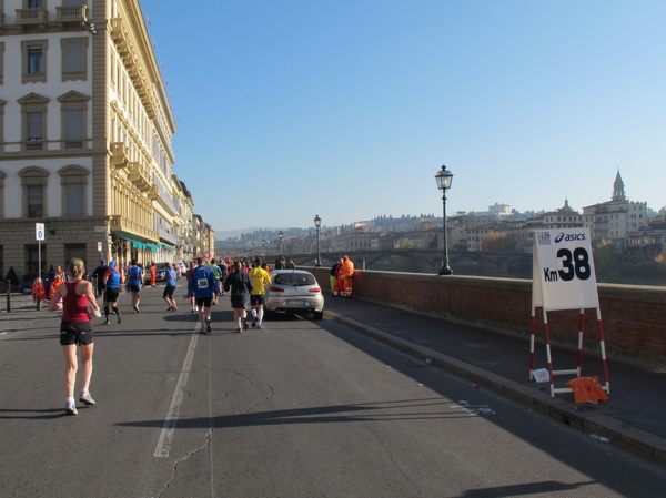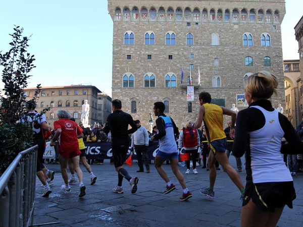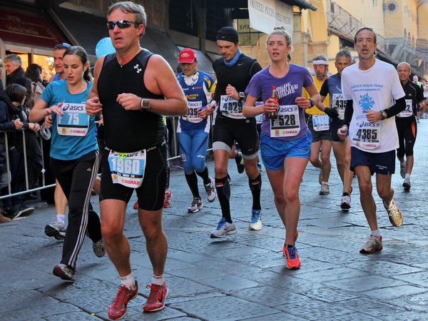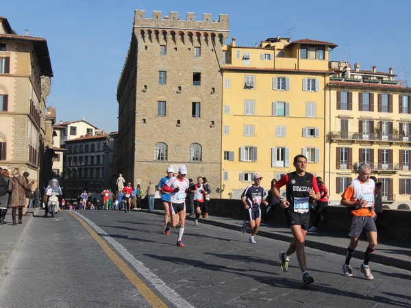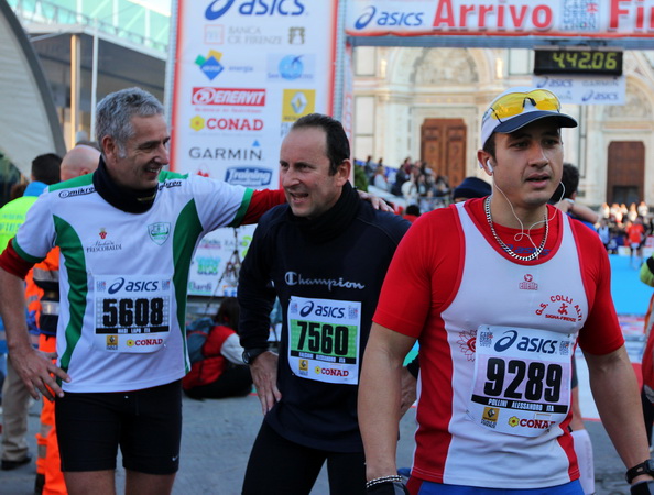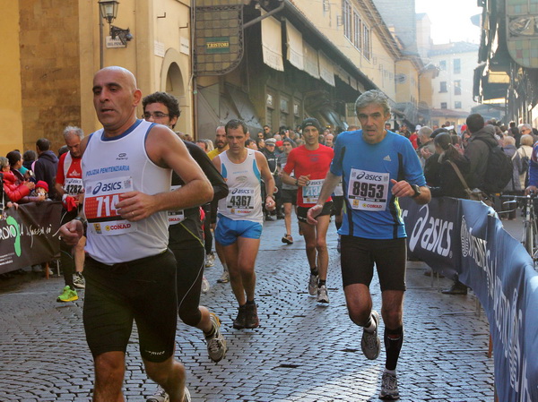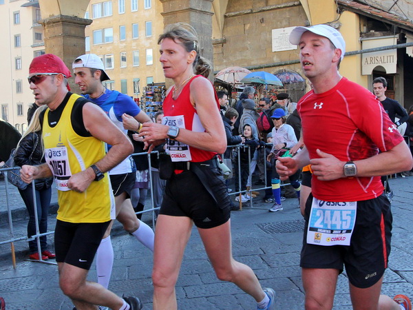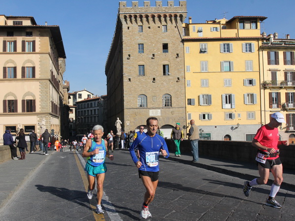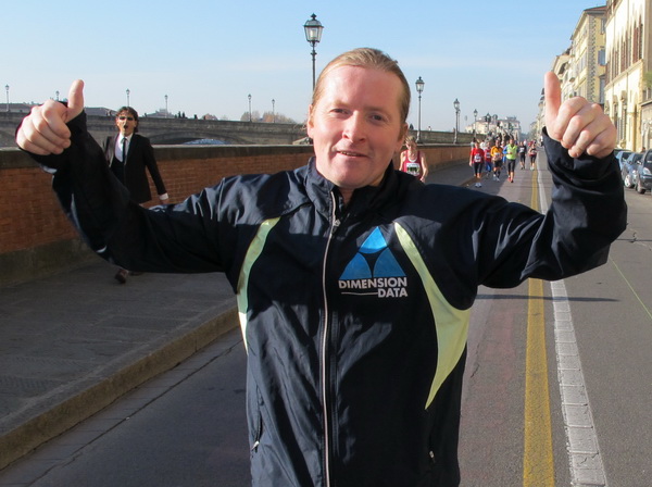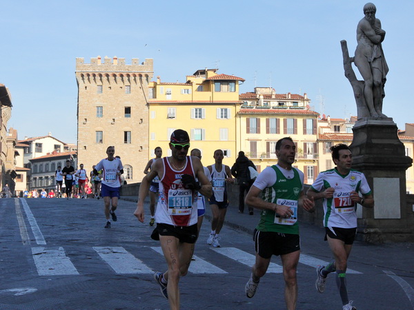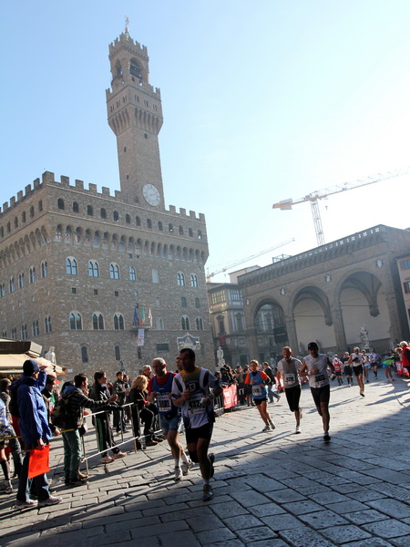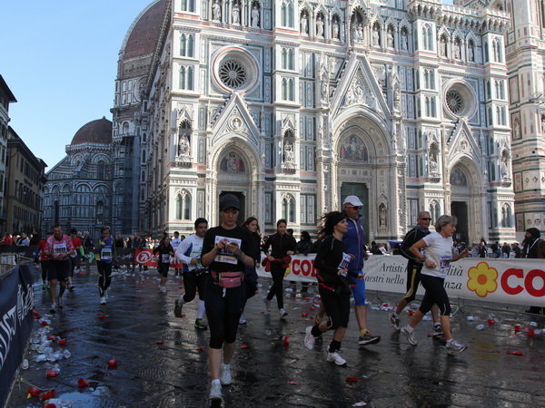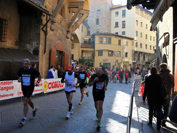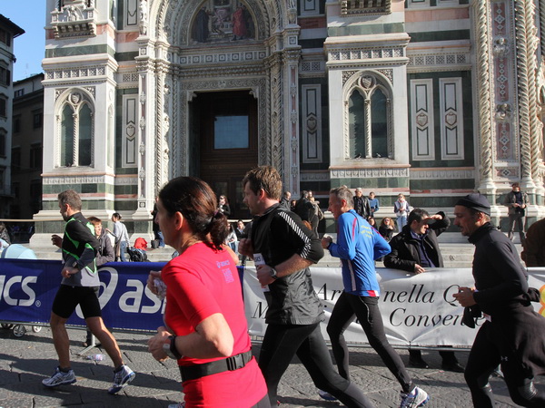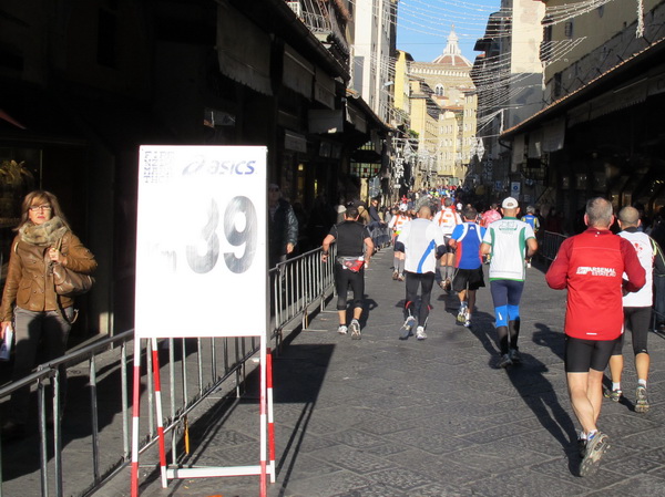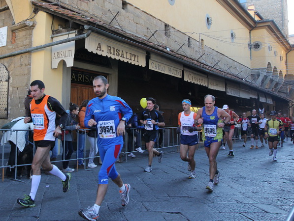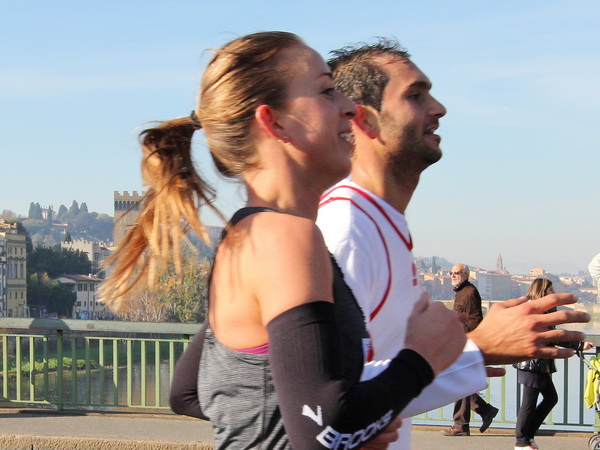 Durch eine schmale Gasse erreichen wir das Arno-Ufer, wo aufgereiht die roten LKW-Aufleger mit den Kleiderbeutel stehen. Hunderte Läuferinnen und Läufer ziehen sich dort um, als die Gruppe „Marathon Abili“ mit ihren behinderten Freunden auftaucht. Spontan versammeln sie sich an der Strecke und bereiten den wahren Helden dieses Laufes einen Empfang, dass es denen die Tränen die Augen treibt. Es ist für mich der schönste Moment des Tages.
