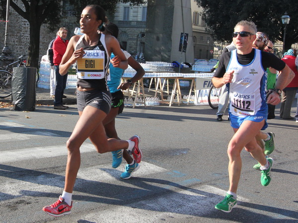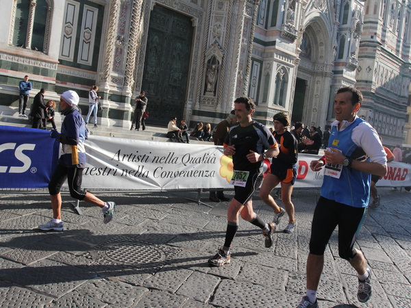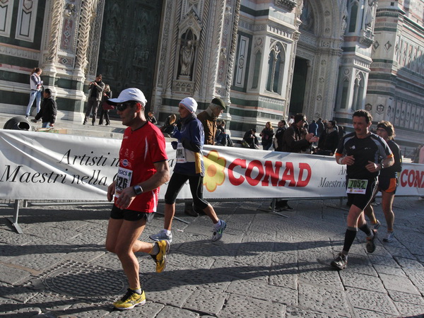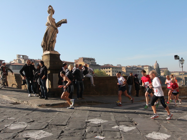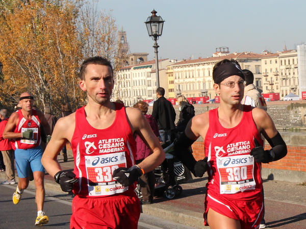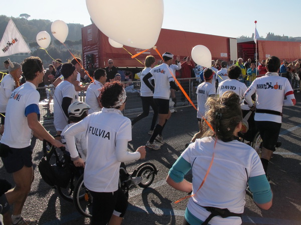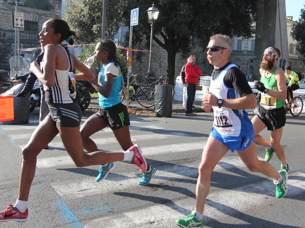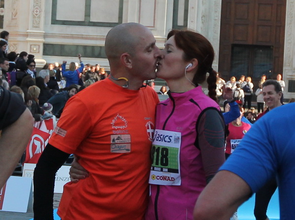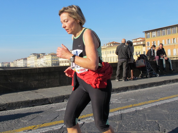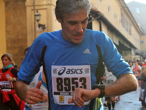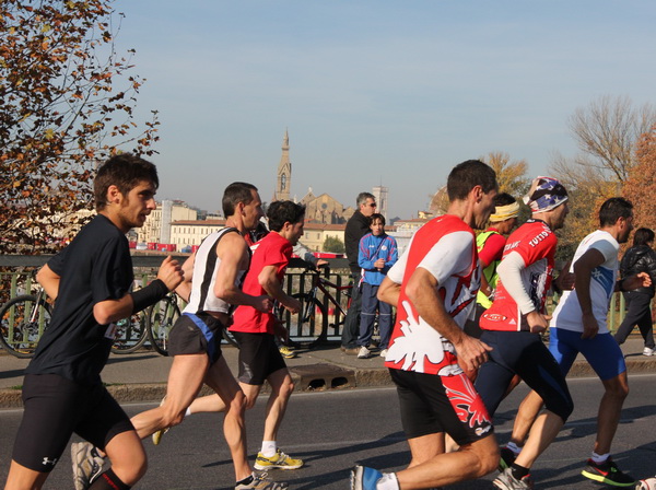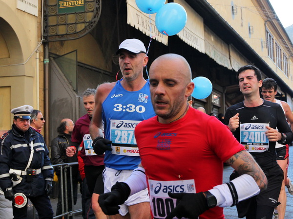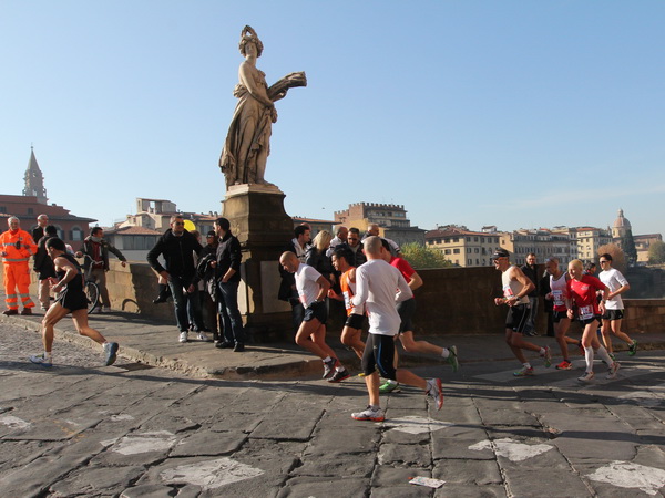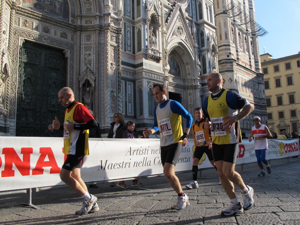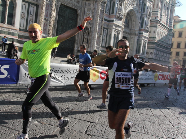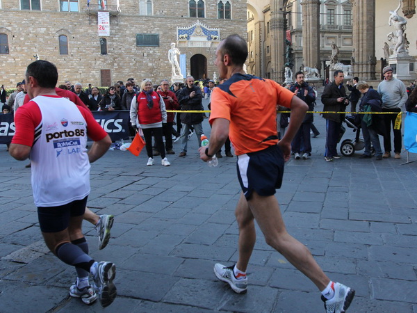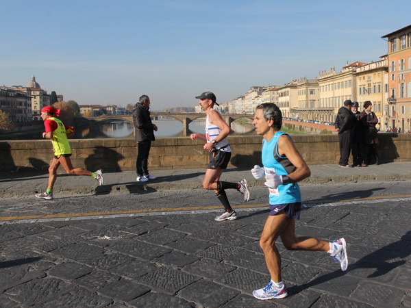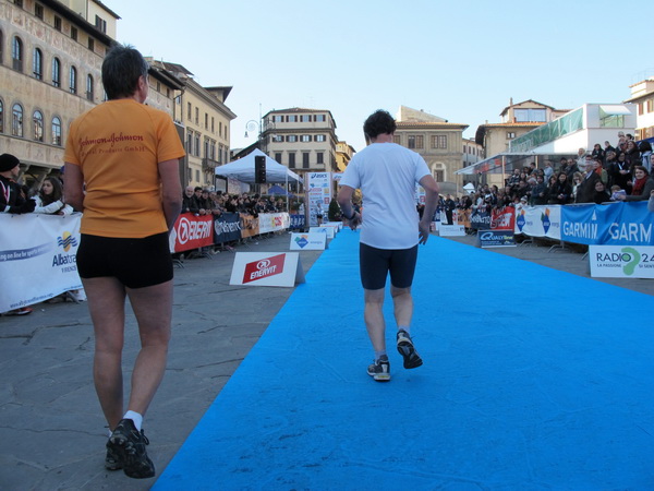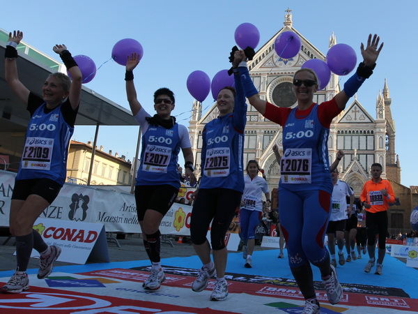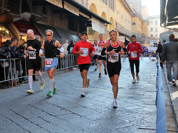 Durch eine schmale Gasse erreichen wir das Arno-Ufer, wo aufgereiht die roten LKW-Aufleger mit den Kleiderbeutel stehen. Hunderte Läuferinnen und Läufer ziehen sich dort um, als die Gruppe „Marathon Abili“ mit ihren behinderten Freunden auftaucht. Spontan versammeln sie sich an der Strecke und bereiten den wahren Helden dieses Laufes einen Empfang, dass es denen die Tränen die Augen treibt. Es ist für mich der schönste Moment des Tages.