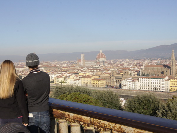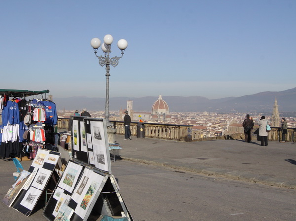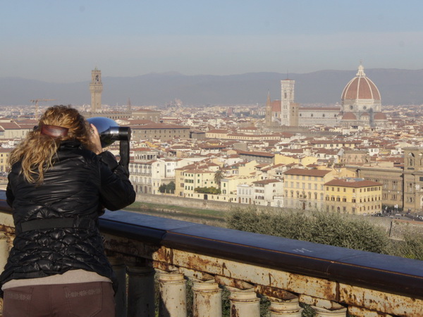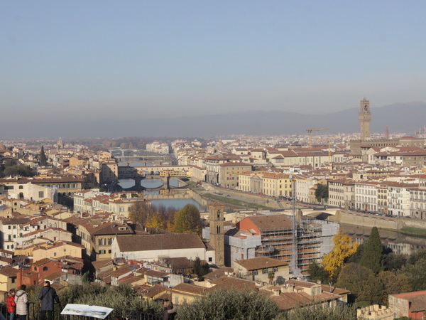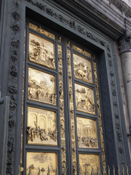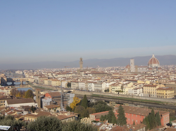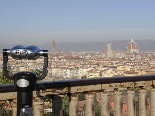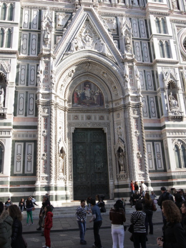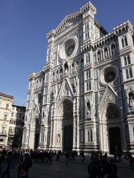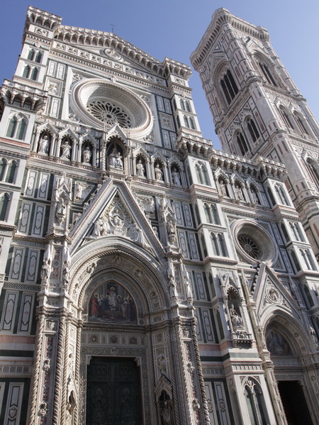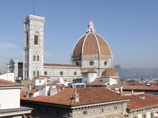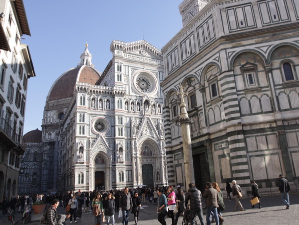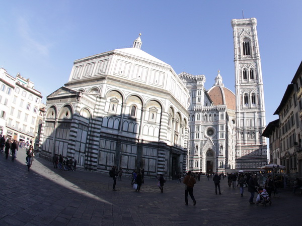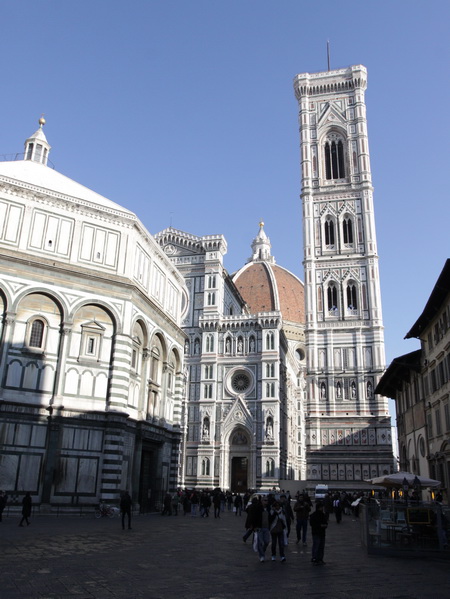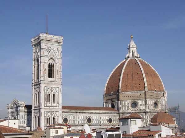 Die Gassen werden jetzt noch enger, noch schattiger noch kühler. Am Ende einer solchen schnurgeraden Gasse sieht man die weiße Fassade des Doms (km 35). Wir laufen rechts, nehmen einen kleinen Umweg und kommen dann auf den Domplatz. Es ist gigantisch. Die Kathedrale Santa Maria del Fiore, das Baptisterium, der Campanile … Es herrschte ein Wettstreit zwischen den Metropolen in Italien. Wer baut die größte Kirche, wer wagt die kühnste Konstruktion? Florenz wollte Maßstäbe setzen und beauftragte Bunelleschi mit dem Bau einer Kuppel, die größer sein sollte, als die des Pantheon in Rom. Weil der von Giotto geplante Glockenturm irgendwann nicht mehr weiter gebaut wurde, überragt ihn heute die Kuppel deutlich. Geht mal in das Kaufhaus Rinascente. Dort gibt es auf dem Dach ein Café von dem aus ihr glaubt, auf gleicher Höhe der Kuppel zu sein. Der Blick ist sagenhaft.