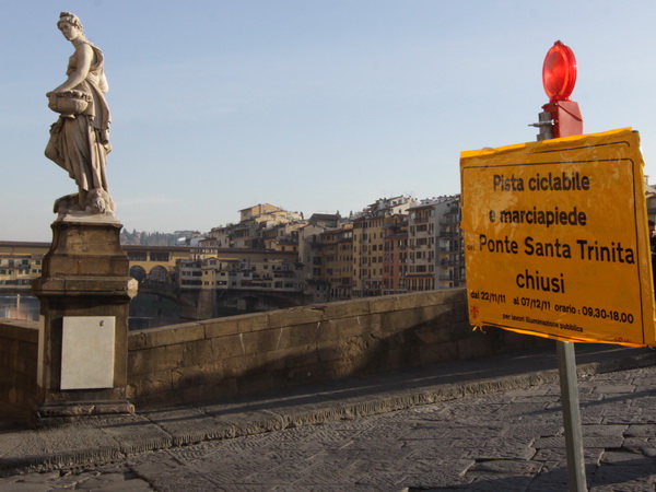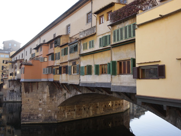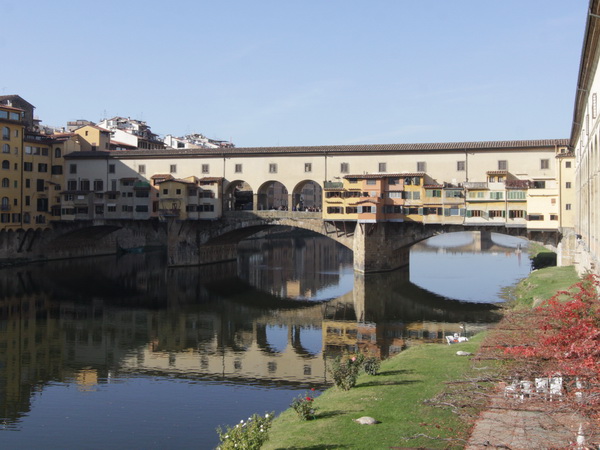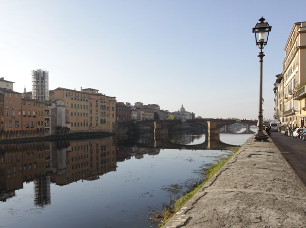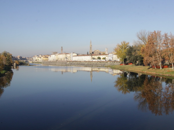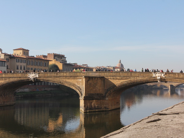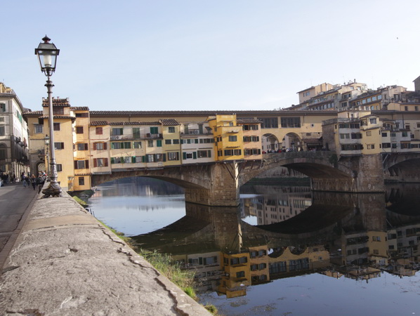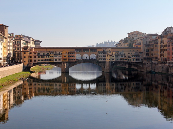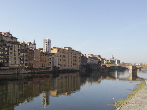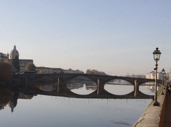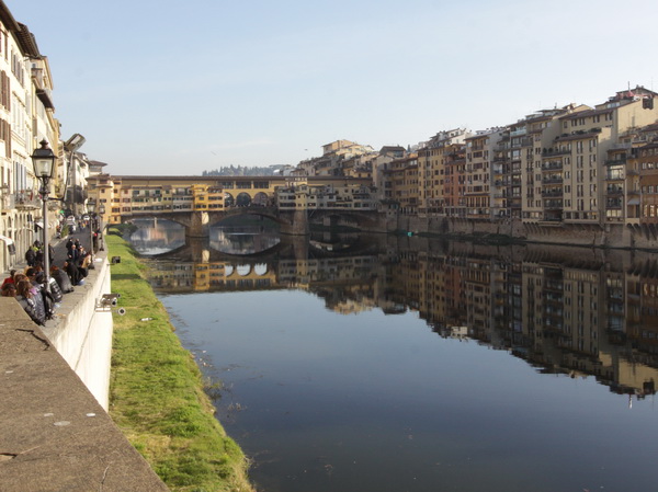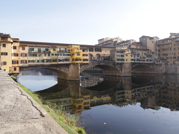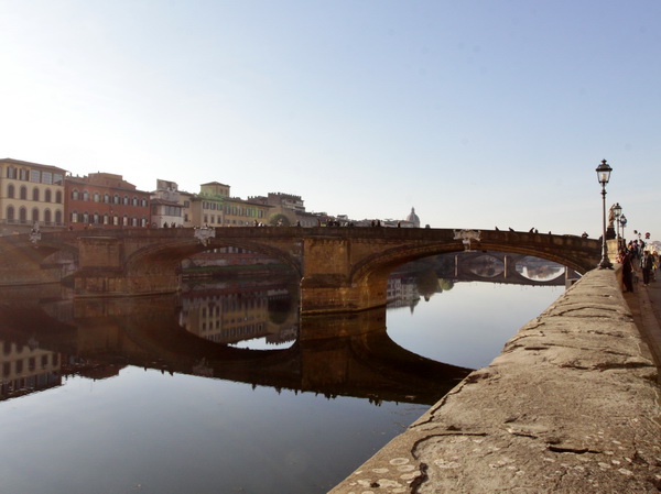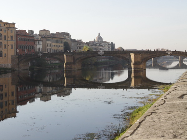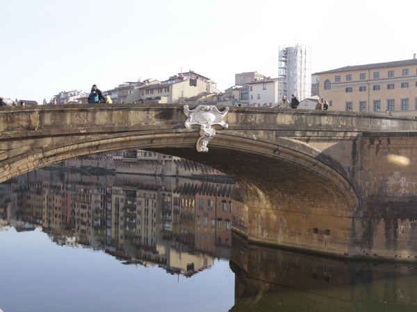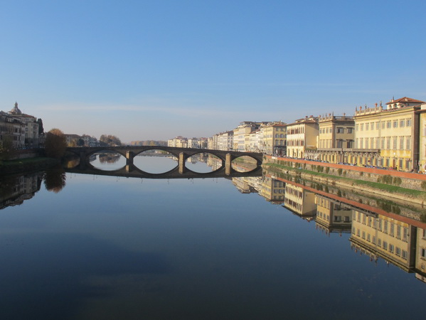 Wir laufen über die Brücke Santa Trinita, die älteste dieser Art weltweit. Die vier Statuen symbolisieren die vier Jahreszeiten. Noch besser gefällt mir aber die Ponte alla Carreira, die westlich liegt. Ich traue meinen Augen nicht. Ohne besoffen zu sein, sehe ich alles doppelt. Die Bögen spiegeln sich im Wasser und bilden gleiche Ellipsen, die Häuser, die Ufermauer, alles steht auf dem Kopf. Wo hört die Realität auf, wo fängt die Spiegelung an?