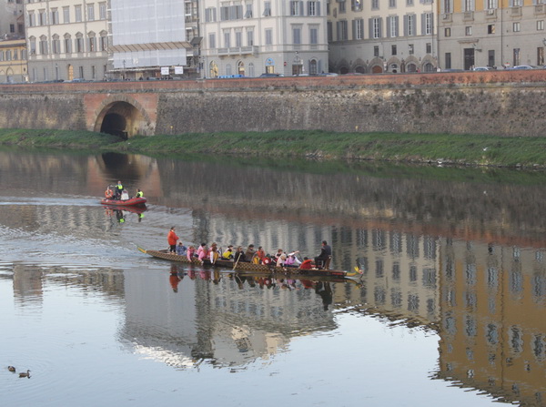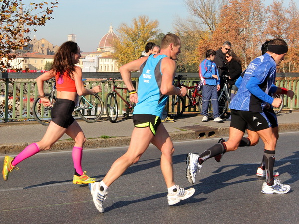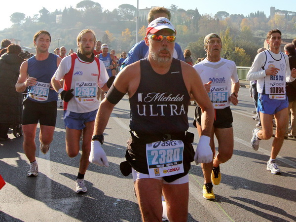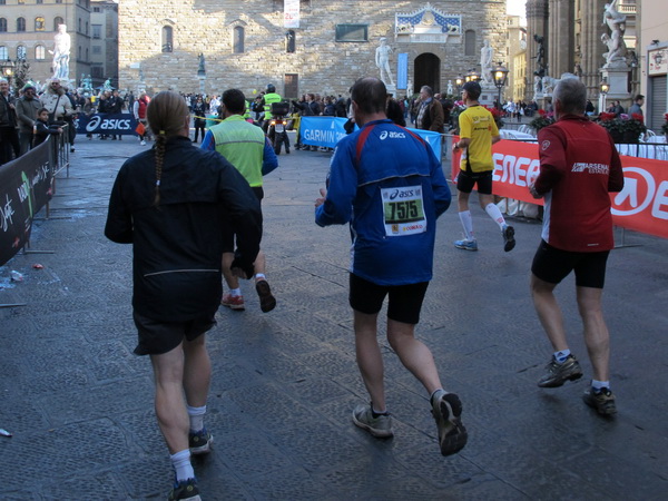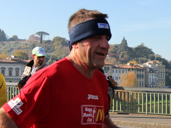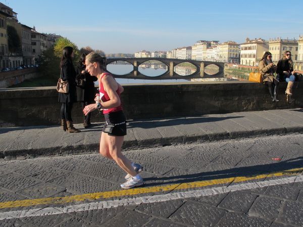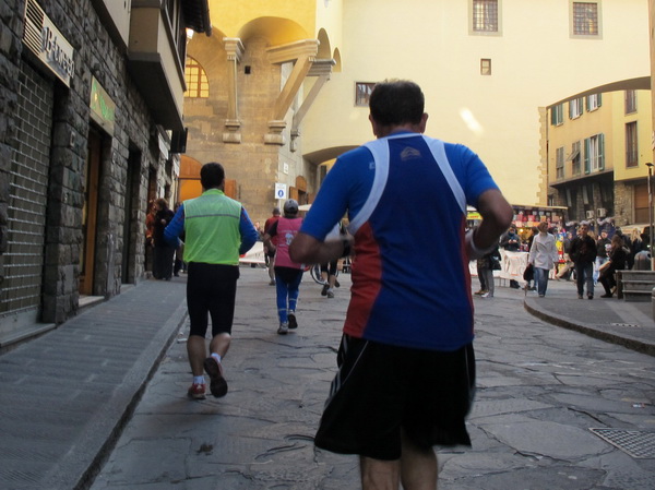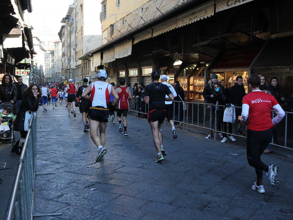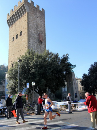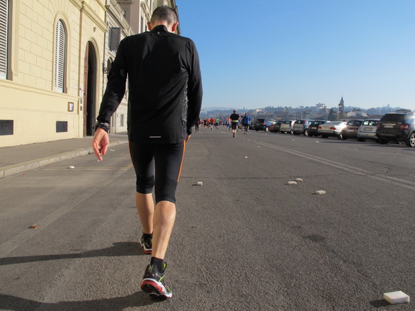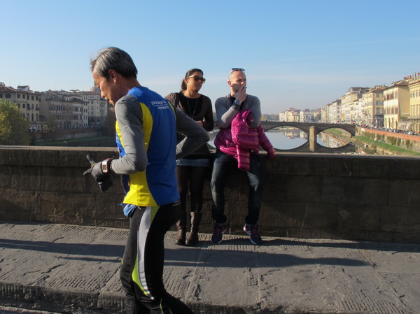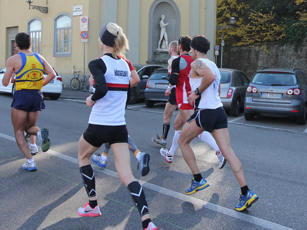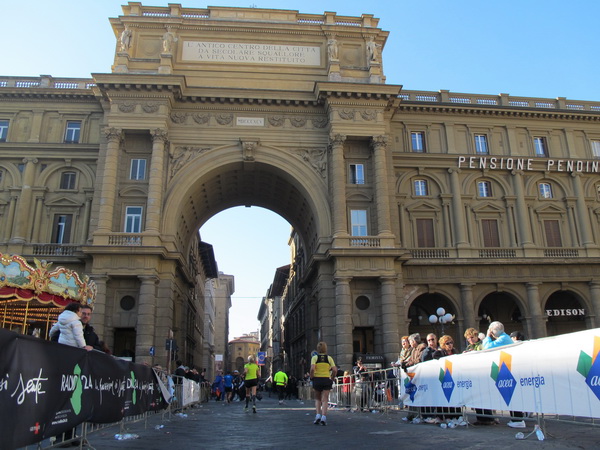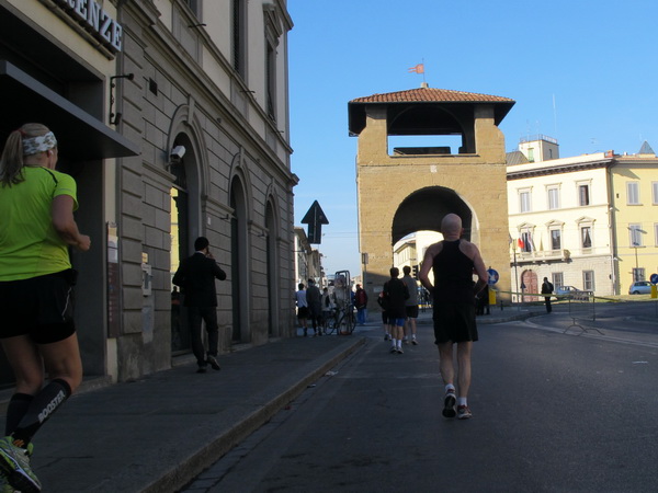 Wir kommen zur Piazza della Repubblicca, links das erwähnte Kaufhaus, rechts der Arcone genannte Triumphbogen, durch den wir laufen. Noch 5 km, wir sind wieder beim Torre Prado, den wir bei km 4 schon einmal gesehen haben. Die Rockband ist noch immer aktiv und gibt gerade „Knocking on Heavens Door“ in der Version von Gun’s and Roses zum Besten. Gleich sind wir am Arno. Vor mir läuft einer mit kunstvoll geflochtenem Zopf. Ich kenne nur zwei Zopfträger: Karl Lagerfeld und Joey Kelly. Und Lagerfeld ist das nicht.