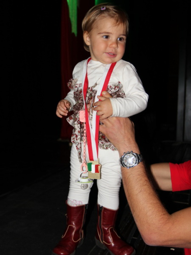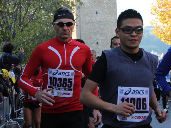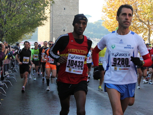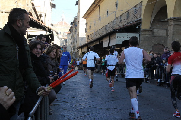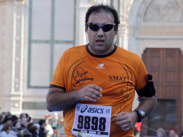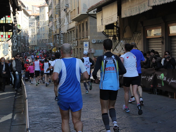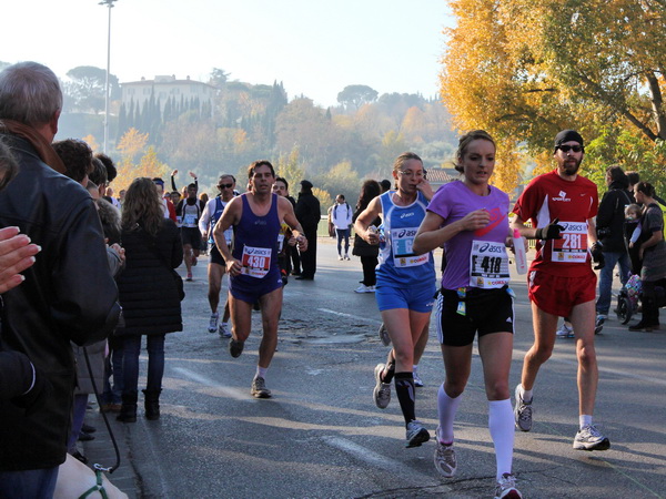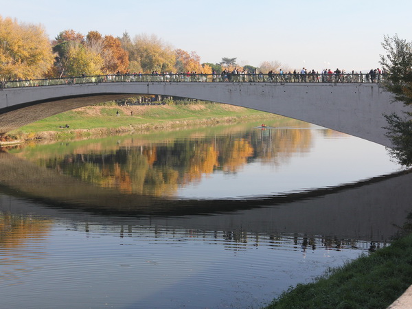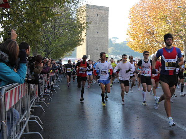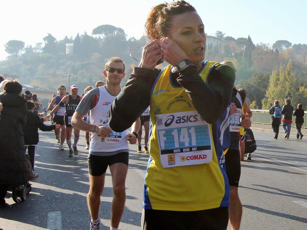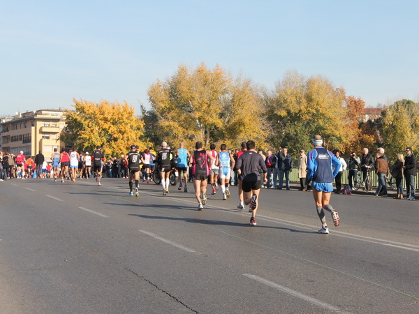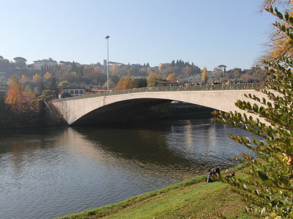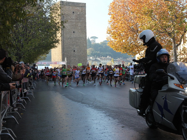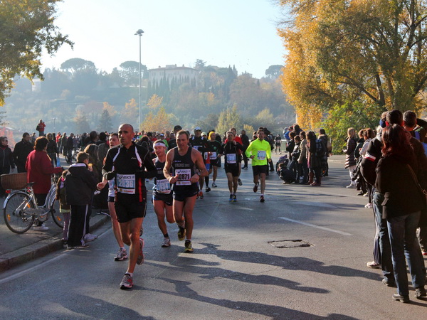 Wir kommen zur Piazza della Repubblicca, links das erwähnte Kaufhaus, rechts der Arcone genannte Triumphbogen, durch den wir laufen. Noch 5 km, wir sind wieder beim Torre Prado, den wir bei km 4 schon einmal gesehen haben. Die Rockband ist noch immer aktiv und gibt gerade „Knocking on Heavens Door“ in der Version von Gun’s and Roses zum Besten. Gleich sind wir am Arno. Vor mir läuft einer mit kunstvoll geflochtenem Zopf. Ich kenne nur zwei Zopfträger: Karl Lagerfeld und Joey Kelly. Und Lagerfeld ist das nicht.