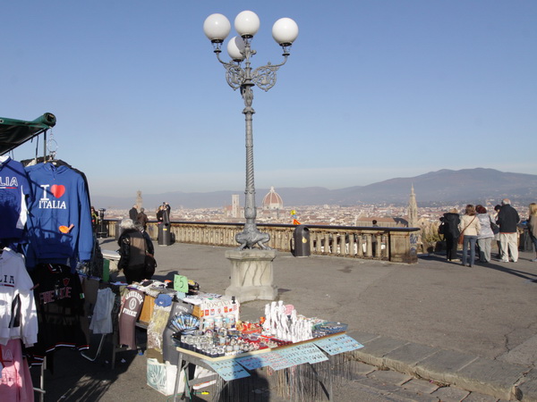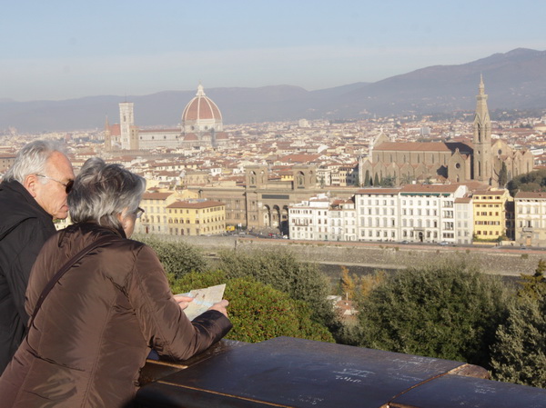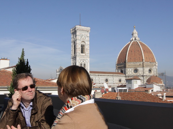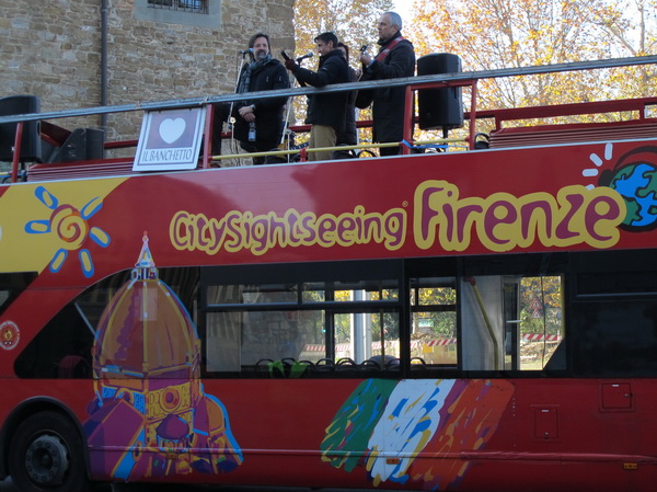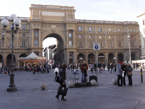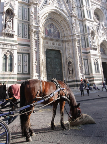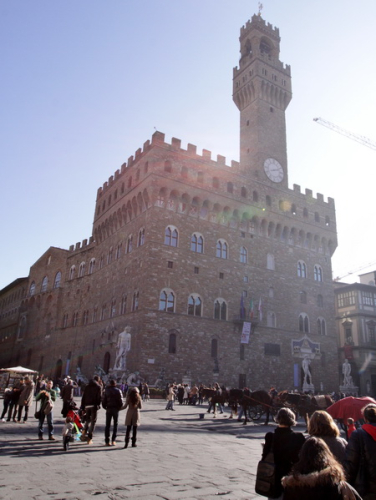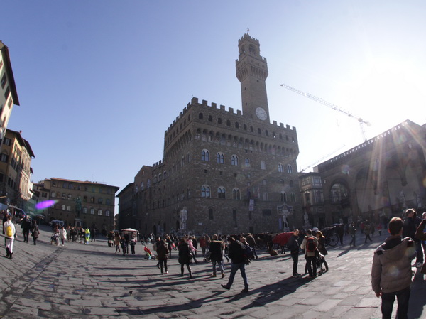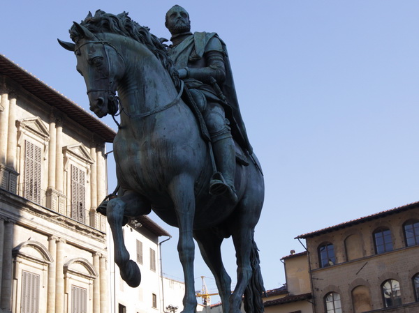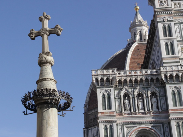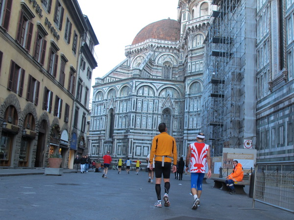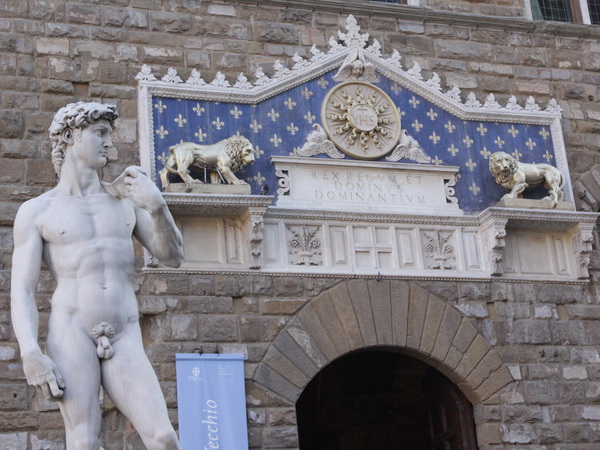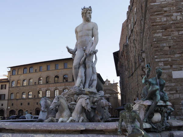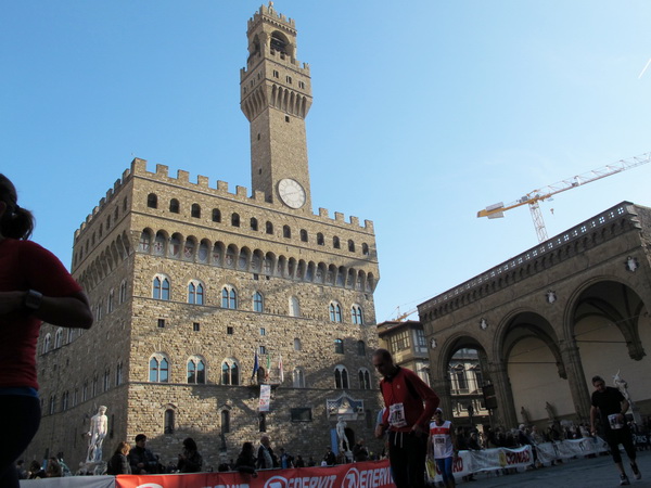 Schon sind wir auf der Piazza della Signoria mit dem besagten Palast, einst Mittelpunkt der weltlichen Macht in Florenz. Mit dem Bau wurde 1299 begonnen, 15 Jahre später zog das Parlament ein. Der 94 m hohe Turm prägt das Stadtbild nicht weniger als der Dom mit seiner Kuppel. Wo heute die David-Kopie steht, stand einst das Original. Bei einer hitzigen Debatte flog einmal ein Tisch durch’s Fenster und beschädigte die Skulptur. Daraufhin suchte man einen sicheren Platz für Michelangelos Kunstwerk. Wir sehen wir noch den Neptun-Brunnen und das Denkmal für Cosimo I. Medici, dann laufen wir noch einmal zum Dom. An der Rückseite werden wir letztmalig mit allem versorgt und fit gemacht für den letzten Kilometer.
