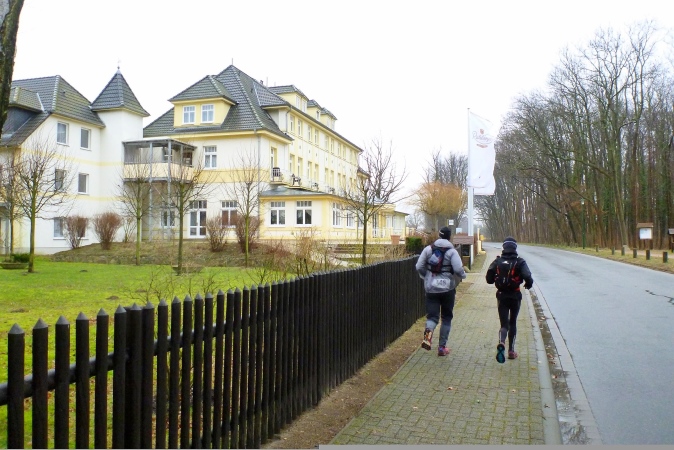 … machen wir uns wieder auf die Strecke. Ein Stück Banane, Cola und Tee gemischt, das wird mir gut tun. Hans-Werner staunt, was so ein Läufermagen alles durcheinander verträgt. Lenz-Süd, an einem Tor lese ich „Blühend steigt der Lenz hernieder, alles liebt und paart sich wieder“. Habt ihr das mal gehört? Die Zeile stammt von einem Frühlingslied von Wilhelm Gottlieb Becker. Na ja, von Frühling ist heute nichts zu spüren, bei einem Grad plus oder zwei.