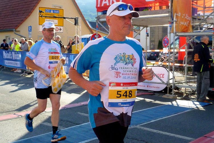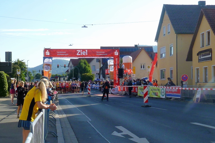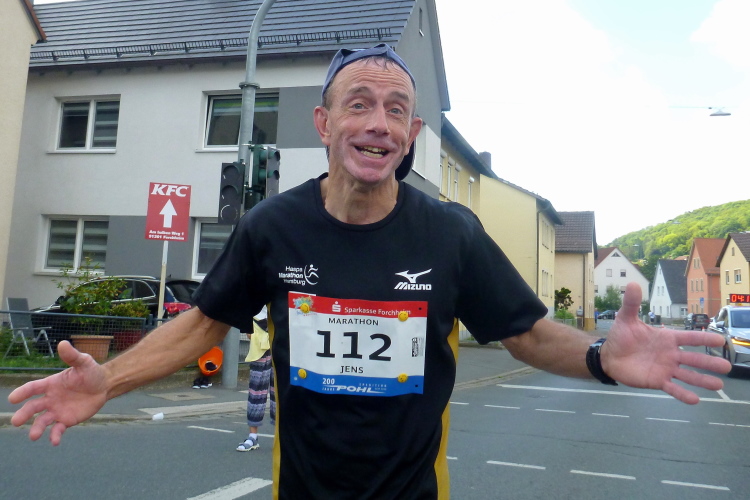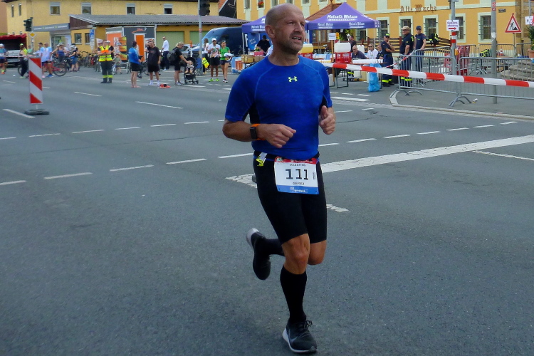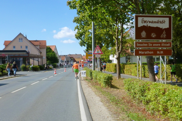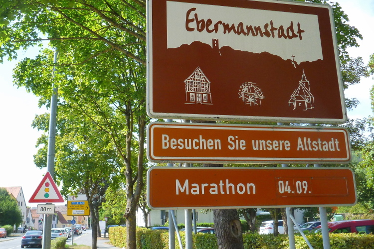 Gasseldorf, ich sehe die Katholische Kirche Maria Hilfe der Christen, dann sehe nach dem kleinen Aufschwung unser Ziel Ebermannstadt. Dort oben steht ein Musikant mit einer „Ziach“, gerade bei der Pause. Auf mein „bravo“ lässt er seinem Arbeitsgerät einen Tusch entlocken. Ganz weit vorne, am Ortsschild von Ebermannstadt, glaube ich den Vier-Stunden-Läufer zu erkennen. Gefällig geht es nun hinunter und schnell hinein in die Stadt. Der Zuschauerzuspruch nimmt sofort zu. Kurz vor dem Zielgelände sehe ich Kilometer 32. Ich laufe unter dem Zieltransparent durch und werde prompt von Moderator Michael angekündigt. Meine persönliche Halbmarathonzeit sei mit gut 1.51 Stunden gar nicht mal so schlecht, meint er. Ich mag gar nicht auf einen vollen Marathon hochrechnen.