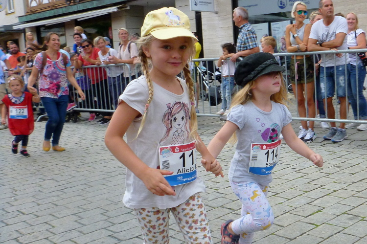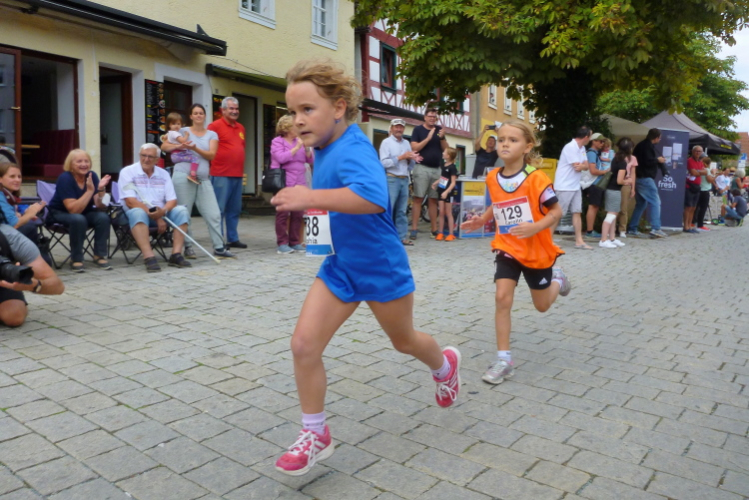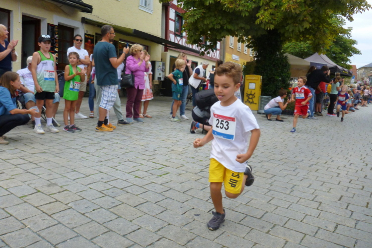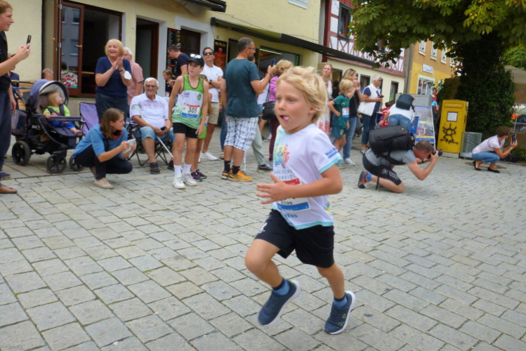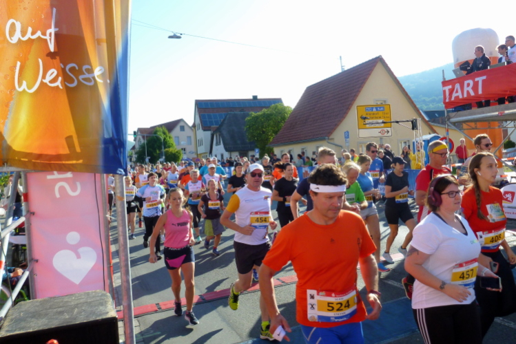 Den Samstag verbringen wir mit einer Erkundung der Kleinstadt mit 7000 Einwohnern. Im Jahr 531 soll hier eine Ansiedelung durch einen Stamm der Thüringer erfolgt sein. Bereits 1323 verlieh König Ludwig der Bayer das Markt- und Stadtrecht und heute ist Ebermannstadt Mittelzentrum. Das Stadtbild prägt die neoromanische Nikolauskirche, bei der es, wie in Bayern auf dem Land üblich, bereits um Sechse in der Früh das Morgenläuten zu hören ist. Bewundernswert ist natürlich das altfränkische Fachwerkhausensemble rund um den Marktplatz und in der Hauptstraße, auch das Schöpfrad an der Wiesent unmittelbar am Landratsamt (Atemschutzzentrum) am Ostrand der Stadt ist ein Hingucker. Dort beginnt bereits ab Samstag 13.00 Uhr die Startnummernabholung. Das Startgelände ist von dort etwa fünf bis zehn Minuten fußläufig entfernt. Dort treiben wir uns dann am Nachmittag herum und schauen uns an, wie der Nachwuchs und die Freizeitläufer ihr Geschäft beherrschen. Und ich muss zsagen, beim Nachwuchs sind schon gute Talente darunter, da bin ich mit Peter auch einig. Dem genügt am Sonntag übrigens der Halbe.