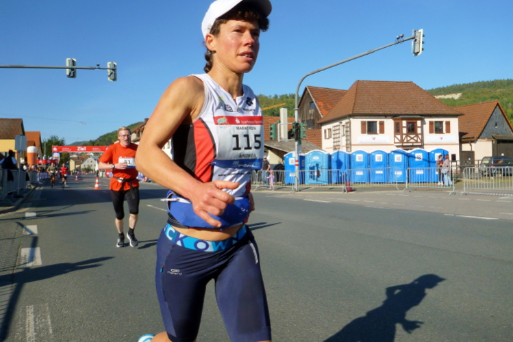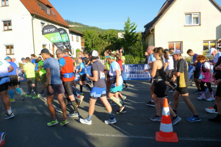 Um 08.35 Uhr wird das Marathonfeld auf die Strecke gelassen. Ich hätte mir ein zahlenmäßig stärkeres Feld gewünscht, aber die Pandemie wirkt wohl noch lange nach. So gehen nur gut 160 Marathonis, dazu knapp 40 Staffeln ins Rennen. Roland findet die Abgabestelle für die Klamotten (Turmhalle der Volksschule) nicht gleich, verspätet sich und beginnt das Rennen von ganz hinten. Einer der Favoriten des Marathons, Isaac Kiprop Sing’Oei, hat Probleme bei der Anbringung der Startnummer und rennt dem Feld mit 1,5 Minuten Verspätung hinterher. Aber nach gut 34 Minuten hat er den Malus beseitigt, denn er erscheint als Erster wieder in Muggendorf. Kurz zuvor und danach startet das Halbmarathonrennen (inklusive der Bayerischen Meisterschaft und der Bayerischen Polizeimeisterschaft) und das 10 Kilometer-Rennen. Ich verfolge die Marathonläufer eine Weile, dann wird nach 65 Minuten Henny von den Moderatoren Michael und Jochen angekündigt. Eine gute Zeit für sie. Ich laufe ihr entgegen, übernehme die Startnummer (auf der Rückseite befindet sich der Chip) und mache mich auf den Weg.