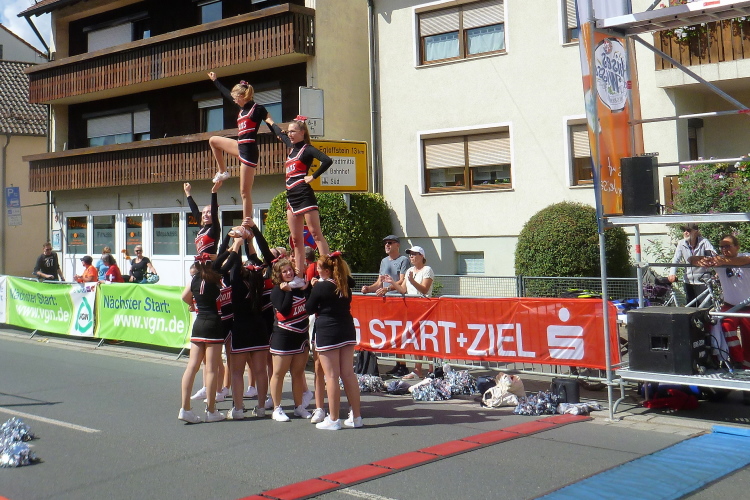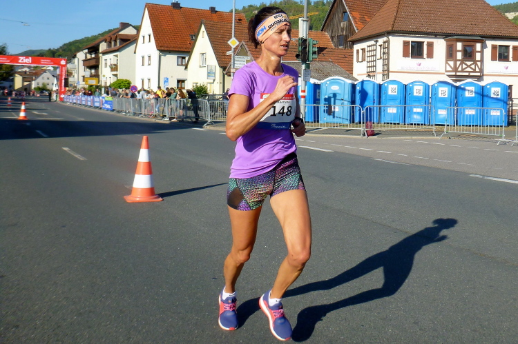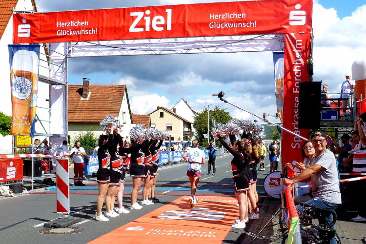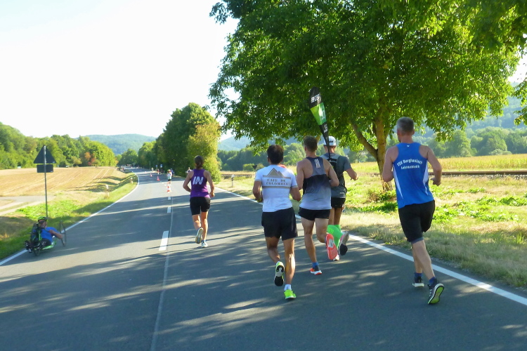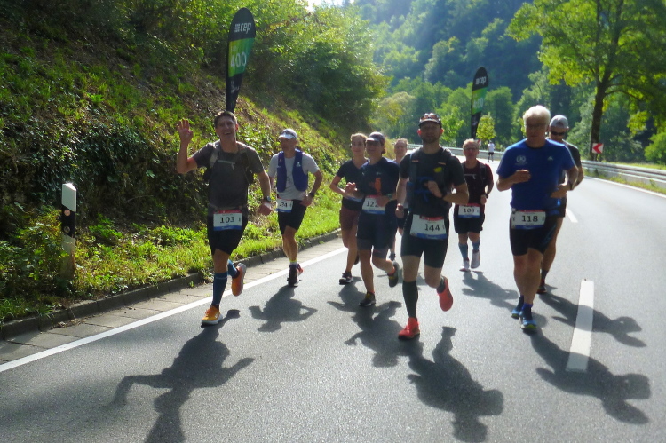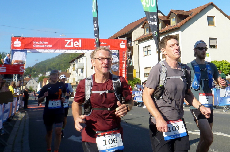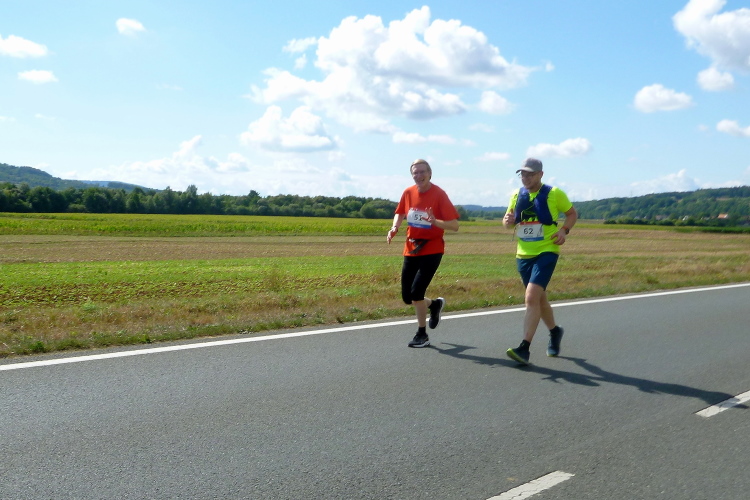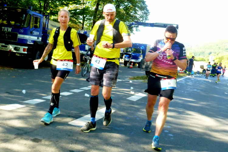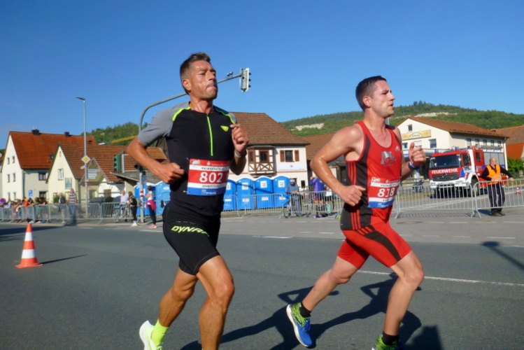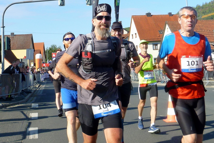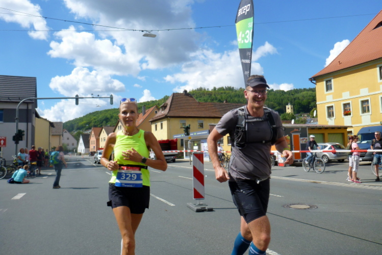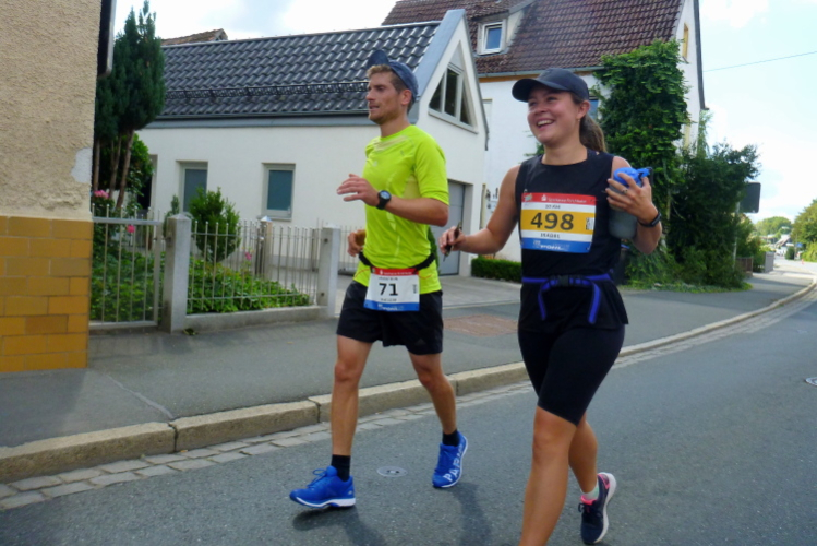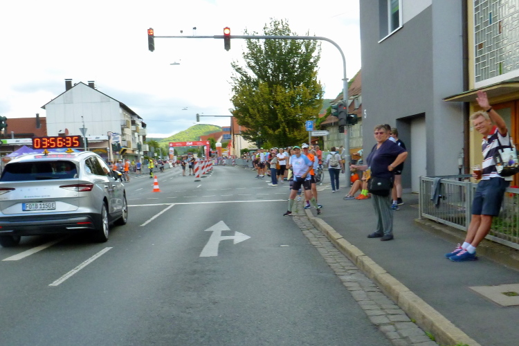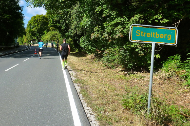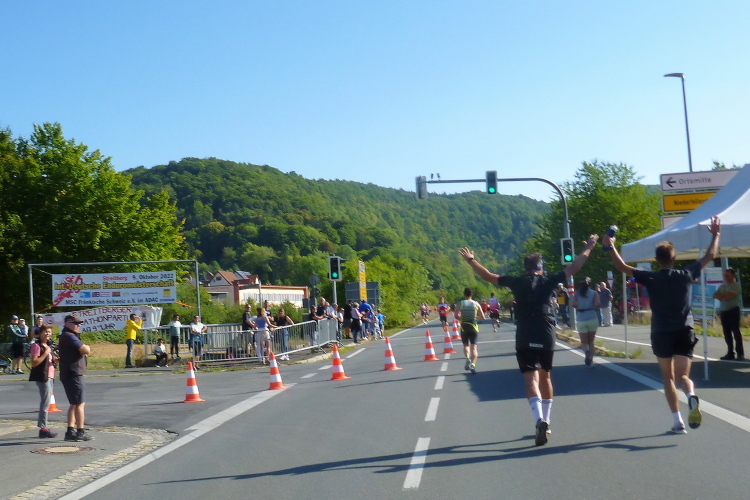 Das Tal weitet sich wieder, die Sonne übernimmt das Zepter. Die Luft hat sich spürbar erwärmt. Nun kommen uns auf der anderen Seite die ersten Paare entgegen, die am Run&Bike teilnehmen, sich also im Laufen und Radeln abwechseln. Das Feld ist sehr übersichtlich und würde deutlich mehr Teilnehmer vertragen. Die Leute, die am Ortsrand von Streitberg am Zaun sitzen, kenne ich. Sie hören Rock'n'Roll aus den 50er und 60er Jahren. Die Erfrischung aus dem Wasserschlauch, den sie aufgedreht haben, wird von den Läufern dankend genutzt.