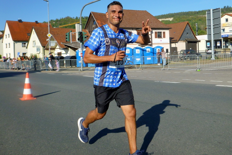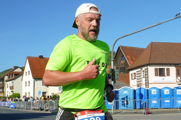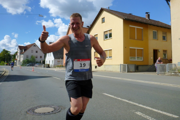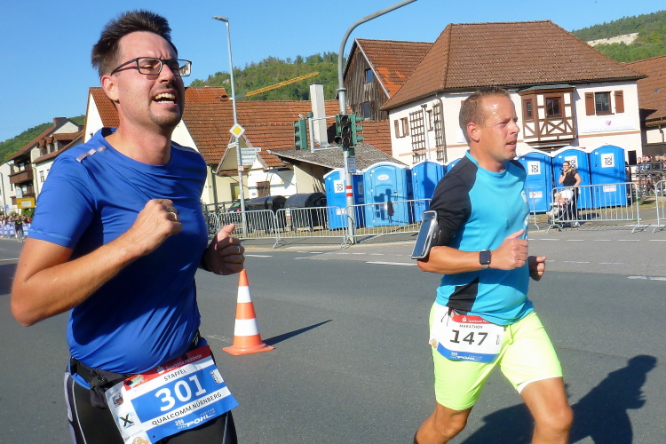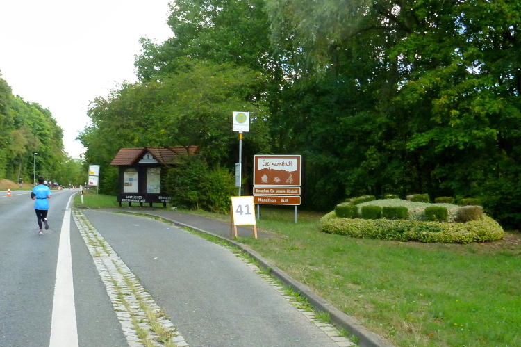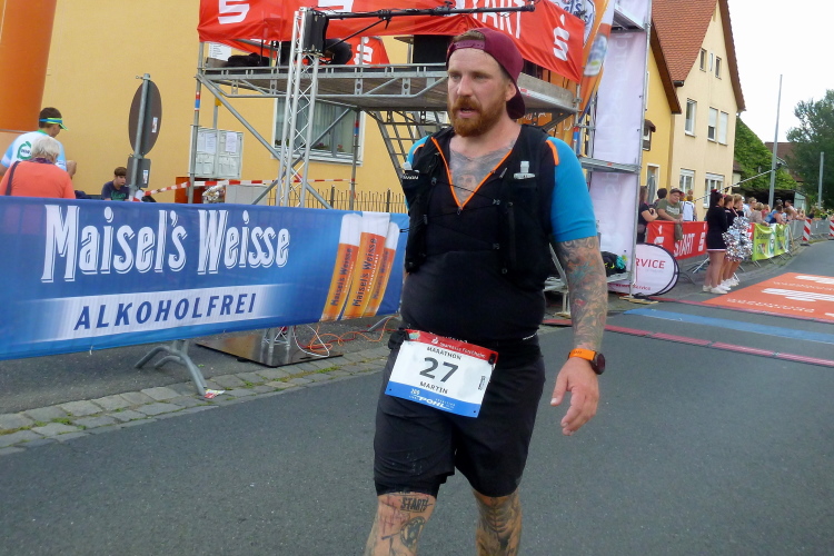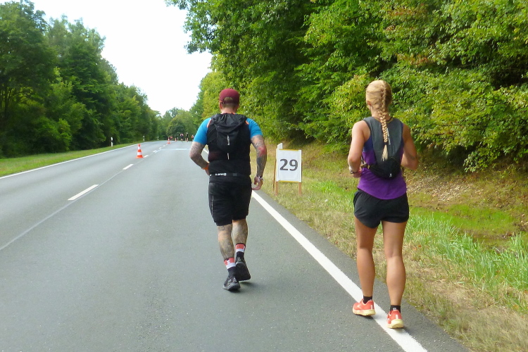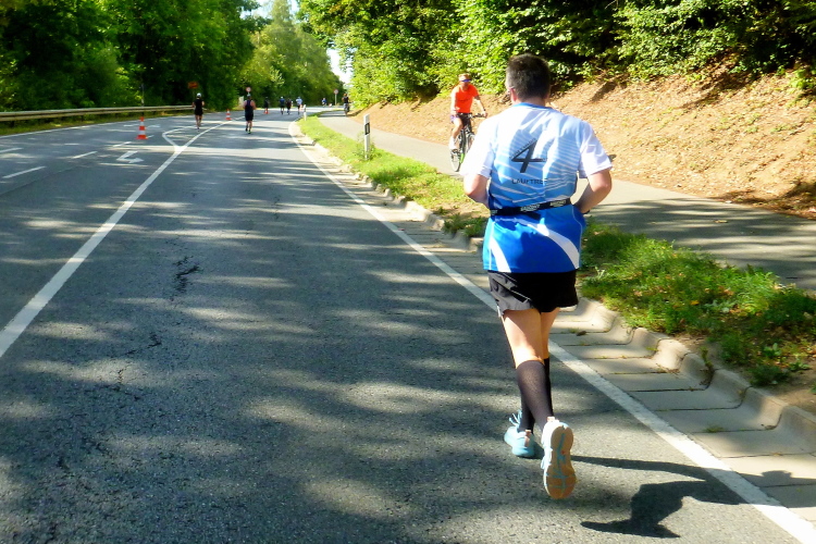 Kilometer 34, die Rüssenbacher haben ihr Marathonfest direkt an die Strecke verlegt. Die Biertische sind voll besetzt, die Zuschauer feiern und klatschen uns weiter. Ich bin nun meinem Ziel deutlich näher gekommen, es fehlen noch rund 100 Meter. Yannick von den FO Fightern läuft auf mich auf und überholt. Mit ihm werde ich mich noch mehrmals duellieren, aber gegen die jugendliche Kraft kann das Alter trotz Routine nicht entgegenhalten. Später wird Yannick seinen Abstand vergrößern. Gut gemacht.
