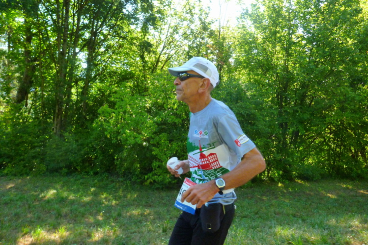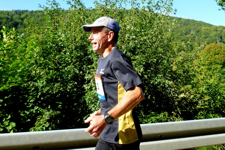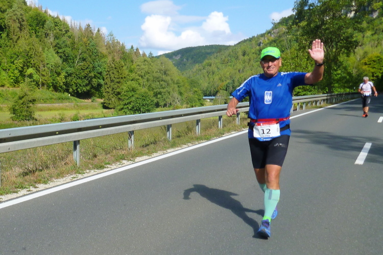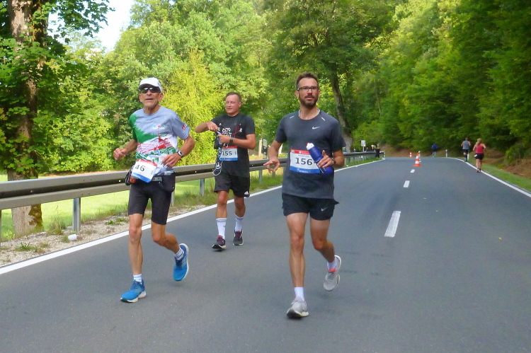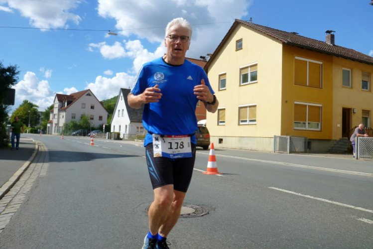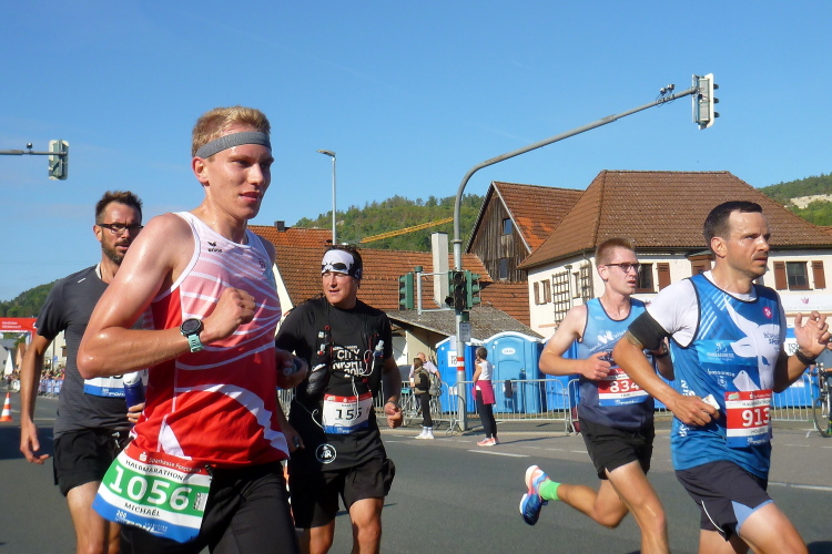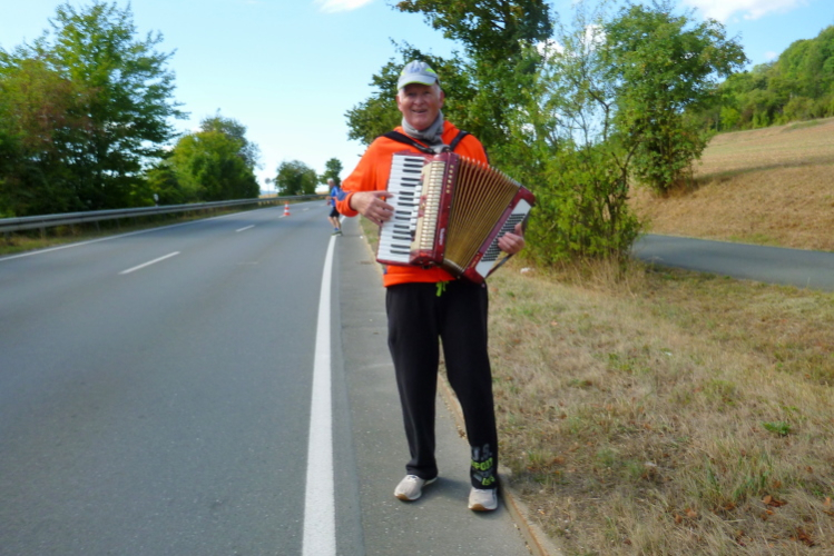 Nun verläuft unser Kurs leicht bergab, es lässt sich gut laufen, meine Kilometerschnitte werden schneller. Ich nehme mir als Ziel vor, auf den Pacer der vier Stunden aufzulaufen, auch wenn der noch einen knappen Kilometer entfernt ist. Auf der anderen Straßenseite grüßen Ulrich und Roland B.. Zurück in Muggendorf macht eine Sambagruppe gerade Pause und lässt sich auch auf mein Rufen nicht aktivieren. Zumindest ein Trommler gibt mir den Takt fürs Laufen vor.