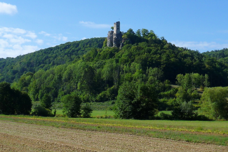 Rechterhand sehe ich dann jenseits der Wiesent die Burg Neideck, die im Jahr 1219 erstmals urkundlich erwähnt wurde. Sie liegt auf einem ausgesetzten Sporn und war daher im Mittelalter nur schwer einzunehmen. Heute ist sie ein Wahrzeichen der Fränkischen Schweiz.