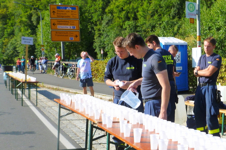 Oben wartet meine erste Trinkstelle mit Wasser und Iso, später werden noch Bananen und ganz zum Schluss Cola und Müsliriegel gereicht. Und wer noch etwas „Handfestes“ braucht, kann sich einen Schluck von den vielen Zuschauern oder bei den Festen entlang der Strecke schnorren. Wir sind ja hier in der Region mit der höchsten Brauereidichte der Welt.