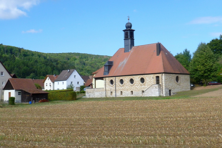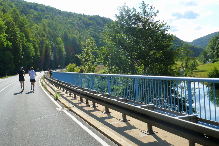 Das Tal engt sich ab dem nächsten Ort spürbar ein. Muggendorf ist bekannt für die zahlreichen Höhlen (Rosenmüller-, Witzen- und Oswaldhöhle). Die St.-Laurentius-Kirche dominiert das Ortsbild. In einem weiten Bogen führt unser Kurs nun um den Sportplatz herum. Die Bundesstraße wird schmäler, das Tal nochmals enger. Vorteil, es gibt mehr Schatten. Auf der anderen Seite kommen nun die Vier-Stunden-Pacer entgegen, mit einigen Läufern im Gefolge. Man grüßt sich artig.