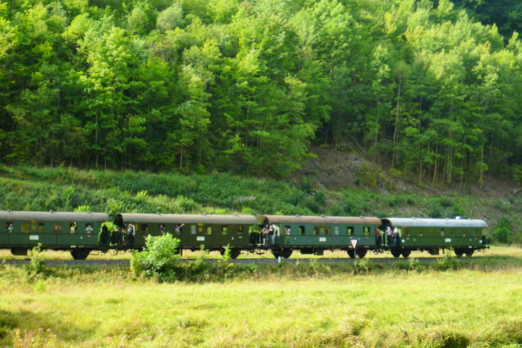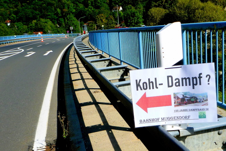 Am „Brückla“ Muggendorf zeigt ein Wegweiser nach links. „Kohl-Dampf“ lese ich, eine Einkehr für durstige und hungrige Sportler ist eingerichtet und wer schlecht zu Fuß ist oder einfach die Aussicht genießen will, kann mit der Dampfbahn ab Ebermannstadt anreisen.