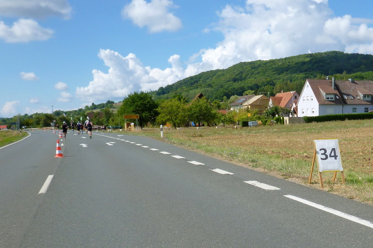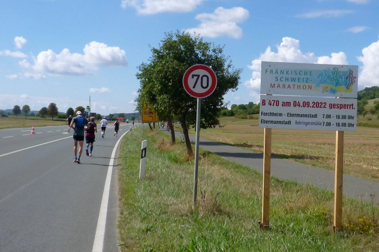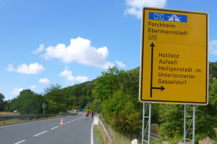 Auf der anderen Seite der Bundesstraße kommen uns nun vereinzelt die Handbiker entgegen. Die sind nun auf den letzten Kilometern unterwegs und haben einen entsprechenden Speed drauf. Die Bundesstraße 470 zählt in diesem Bereich zur Burgenstraße, eine ausgewiesene Strecke von Mannheim nach Bayreuth. In der Fränkischen Schweiz berührt die Ferienstraße namhafte Orte, Burgen und Schlösser, wie z. B. die Kaiserpfalz in Forchheim, Egloffstein, Gößweinstein, Pottenstein, Waischenfeld bis zum Schloss Seehof bei Memmelsdorf.