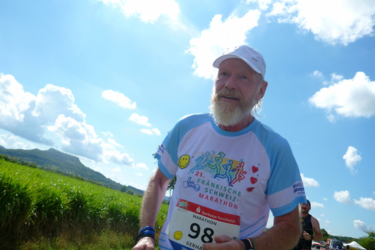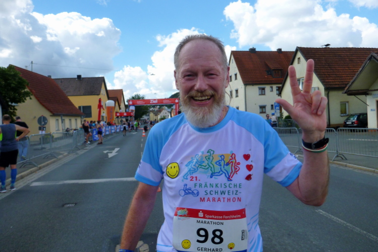 Und dann läuft mein Freund Gerhard ein, vier Sekunden vor der Grenze zu vier Stunden, das ist Maßarbeit. Gerhard freut sich wie ein Kind. Mir erzählt er später von seinen Verletzungen und dass es sehr, sehr lange gedauert hat, bis er wieder einigermaßen trainieren konnte.