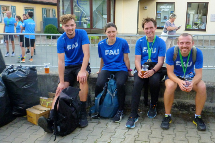 Kilometer 38, ich gehe langsam an Martin und Martina aus Hersbruck vorbei. Leider fehlen ihnen im Ziel nur wenige Sekunden, um in der Gesamtzeit eine drei vorne stehen zu haben. Drei Kilometer weiter geht es wieder in das Stadtgebiet hinein. Ich könnte jetzt noch einen Endspurt ansetzen, aber bei mir geht es ja außer dem Staffel-Finish um nichts. Ich hoffe, dass Henny für einen gemeinsamen Zieleinlauf bereit steht.