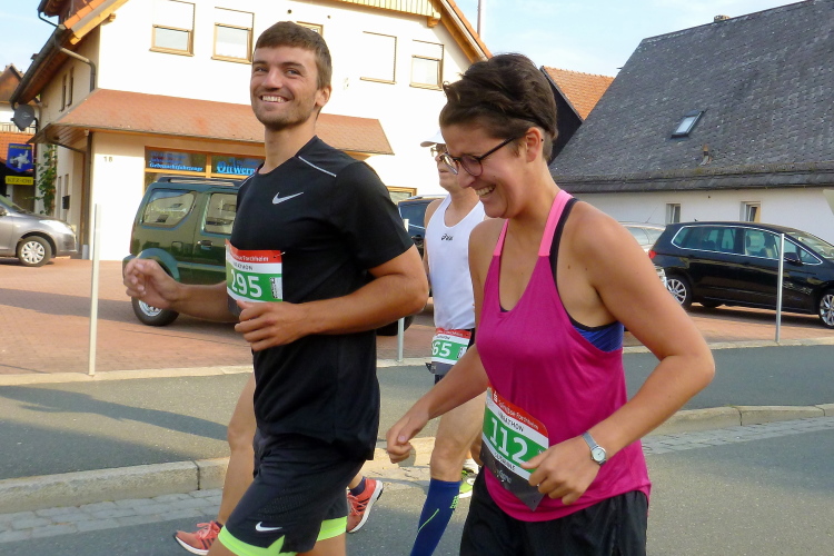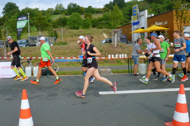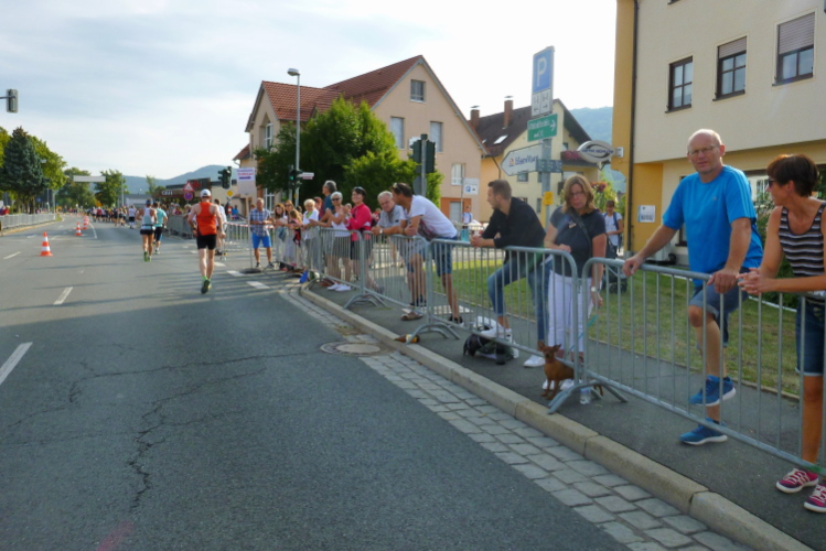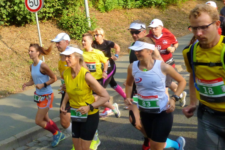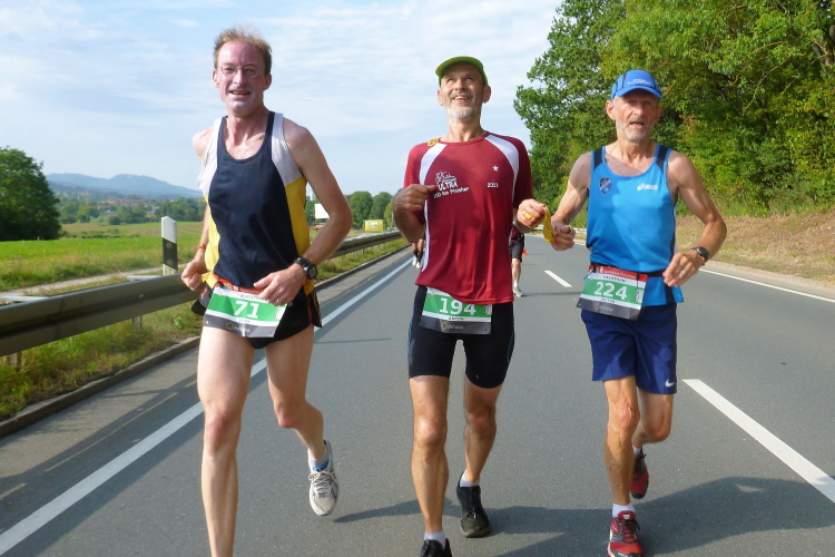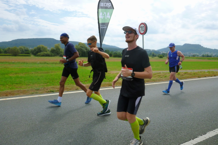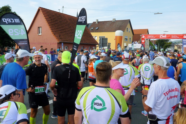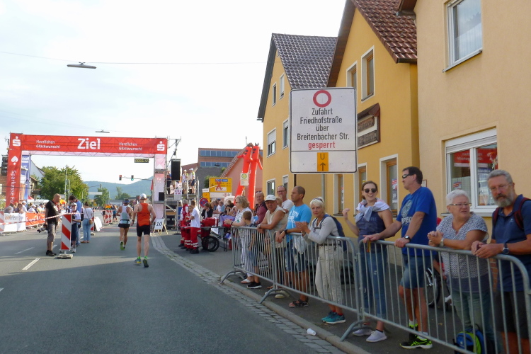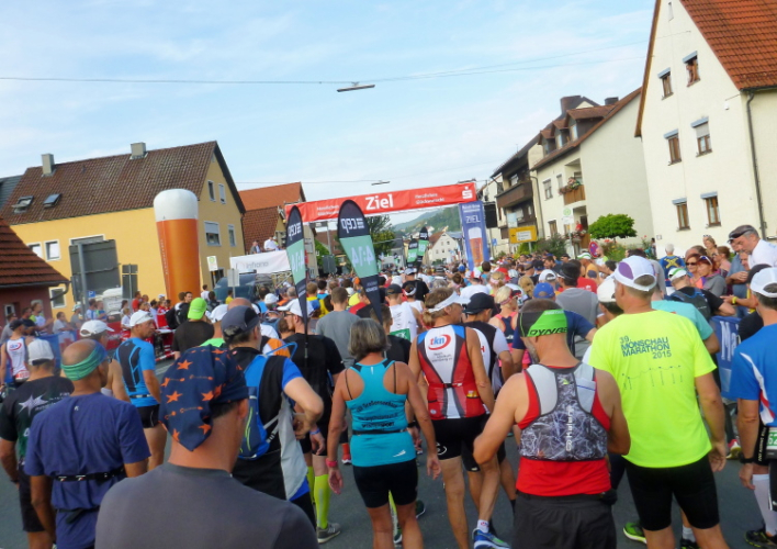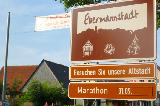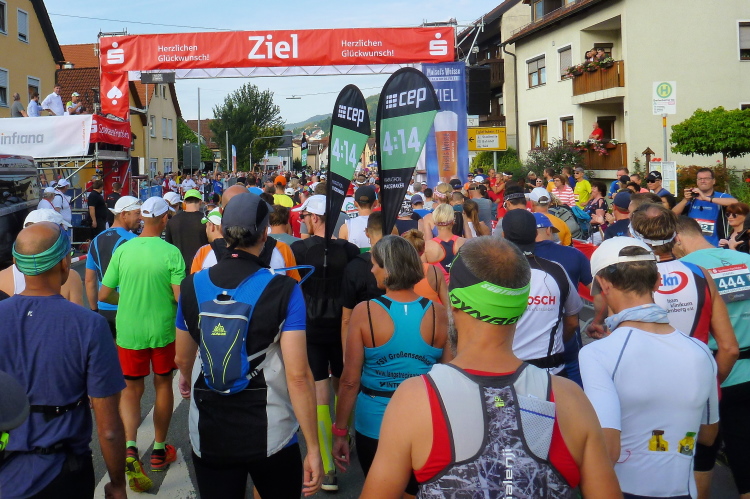 Wir erreichen den Ortsrand Ebermannstadt, da kommen uns auf der anderen Seite die Halbmarathonis und die 10 Kilometer-Läufer entgegen. Zuerst sind es nur einzelne, dann wälzt sich ein breiter Strom im Bereich 1.45 Stunden bis 2.15 Stunden (da gibt es auch einige Pacer) stadtauswärts. Nach wenigen Minuten laufen wir unter dem Start- und Zieltransparent durch. Die Moderatoren Michael Cipura und Jochen Brosig versuchen, so viele wie möglich namentlich anzusprechen. Als M4Y-Reporter ist man bekannt und braucht nicht auf sich aufmerksam machen. 56 Minuten bin ich nun unterwegs. Die vier Stunden, die ich mir insgeheim als Ziel gesetzt habe, werde ich nicht halten können, zumal sich der entsprechende Pacer mit seinen fünf, sechs Anhängern schon vor mir ist.