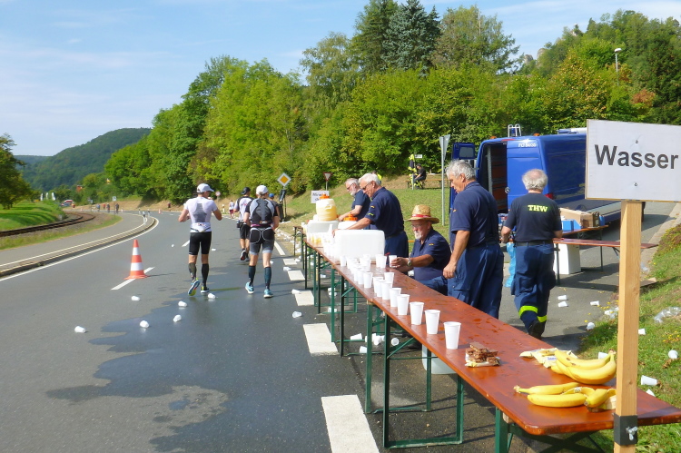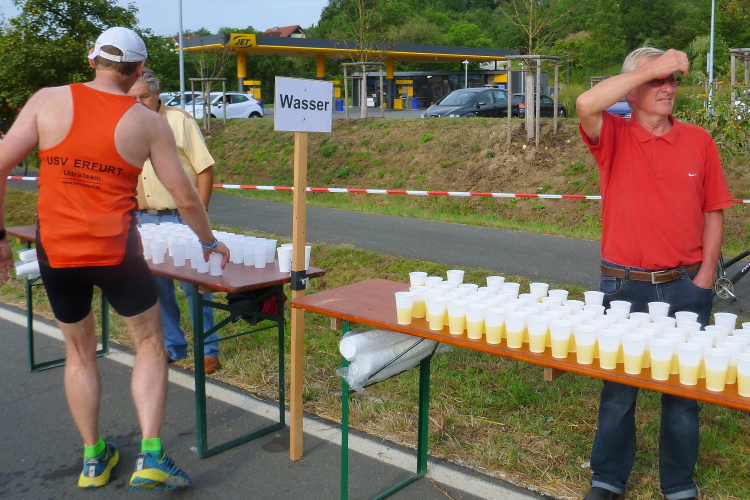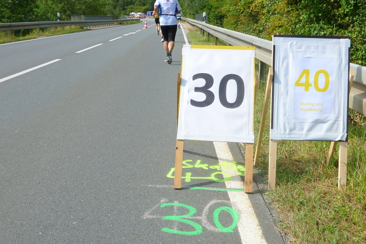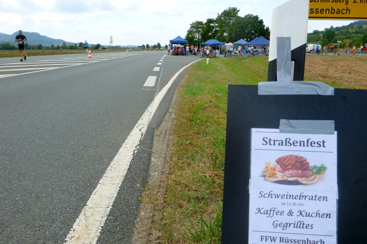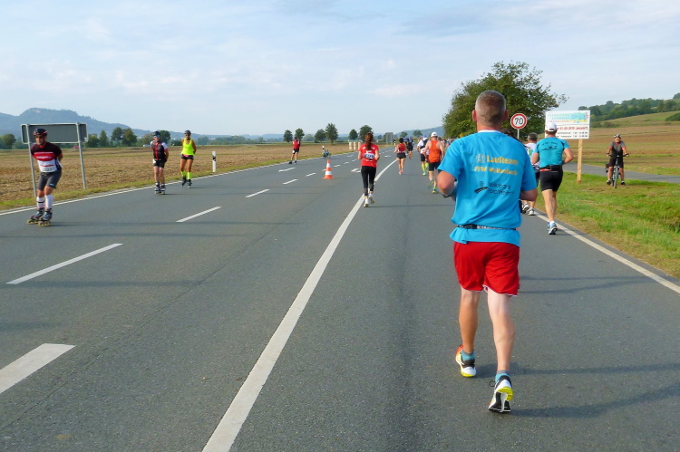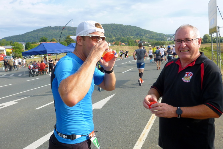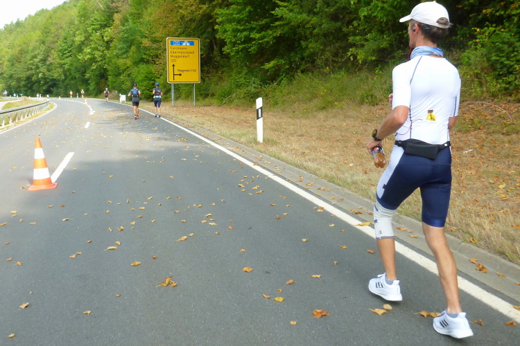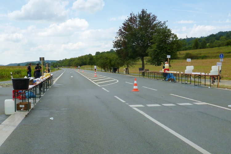 Wir sind noch nicht lange unterwegs, da kommen schon auf der anderen Seite die ersten Handbiker und gleich danach die Inliner entgegen. Schon weit vor der ersten Wende werden wir verpflegt. Wir sind gerade mal drei Kilometer unterwegs, da greife ich zu einem Becher Isogetränk. Es wird heute nochmals sehr warm werden, viel trinken wird notwendig werden. Das Iso ist leider nicht so mein Geschmack. Viel lieber nehme ich das Angebot eines älteren Feuerwehrkameraden an. Er steht mit einem Faltbecher am Rand und preist ein frisches Bier an. Ich kann nicht widerstehen...