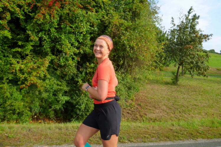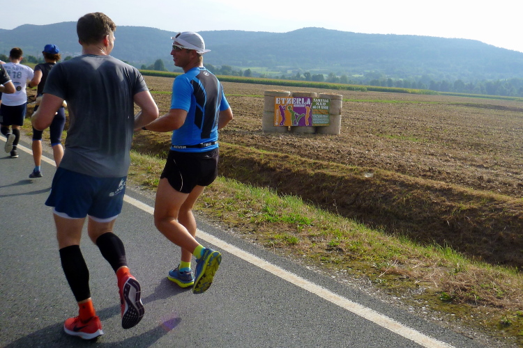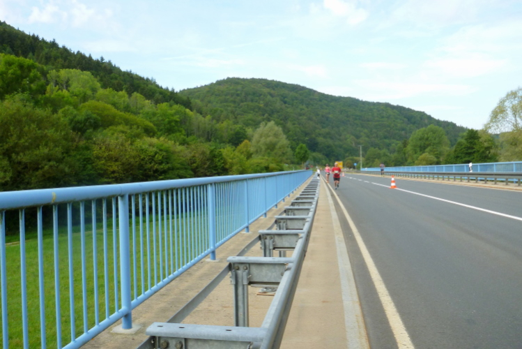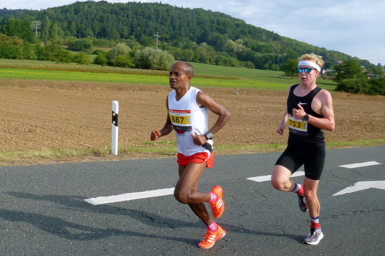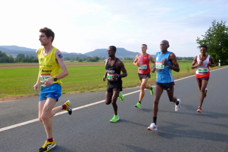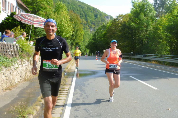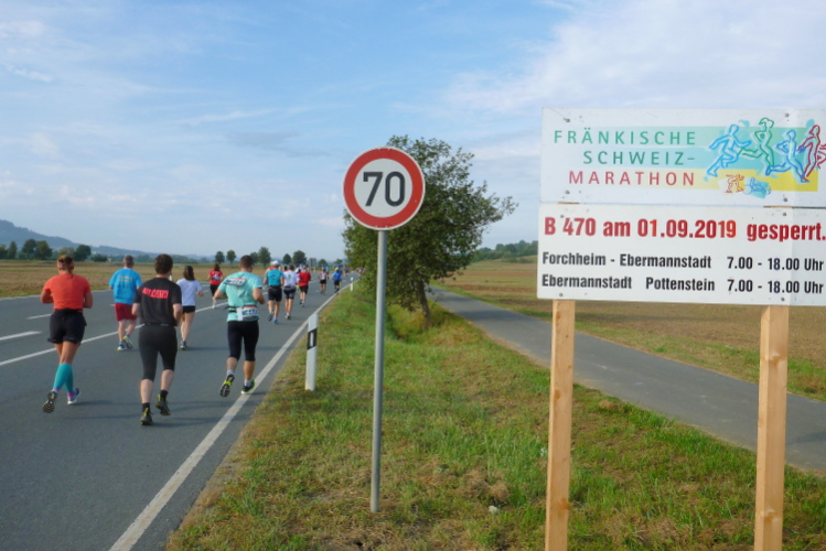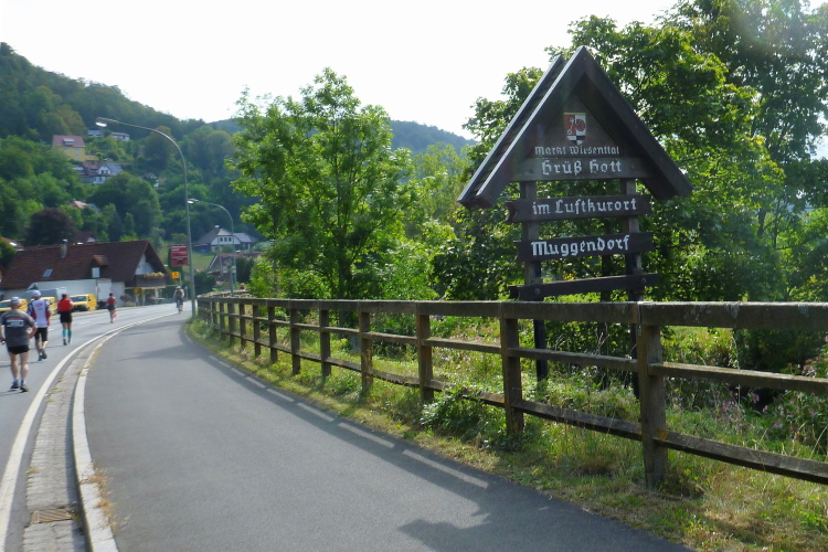 Wir laufen durch das weite Tal der Wiesent, einem knapp 80 Kilometer langen Gewässer, das bei Stadelhofen entspringt und durch mehrere Ortschaften fließt. In Forchheim endet die Wiesent als Zufluss der Regnitz. Die Laufstrecke ist breit genug für uns Läufer und sie ist zusätzlich noch in der Mitte mittels Pylonen abgetrennt, denn wir werden nach genau fünf Kilometer wenden und auf der anderen Seite zurücklaufen. Dieses Pendelstück ist auch die Strecke der Zehn Kilometer-Läufer.