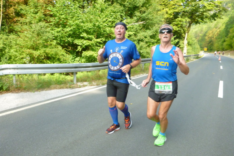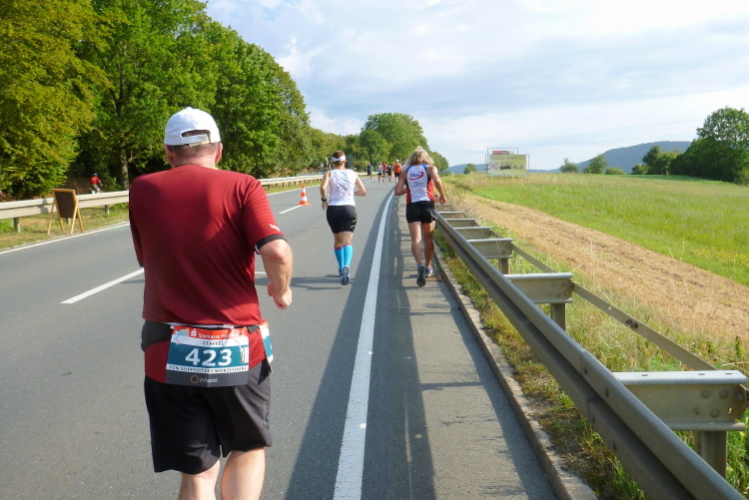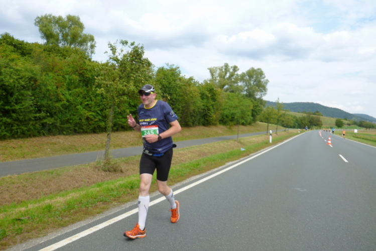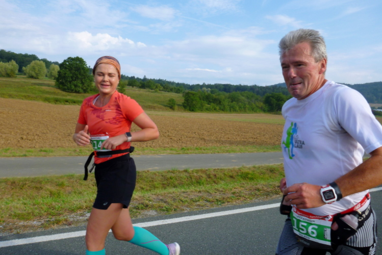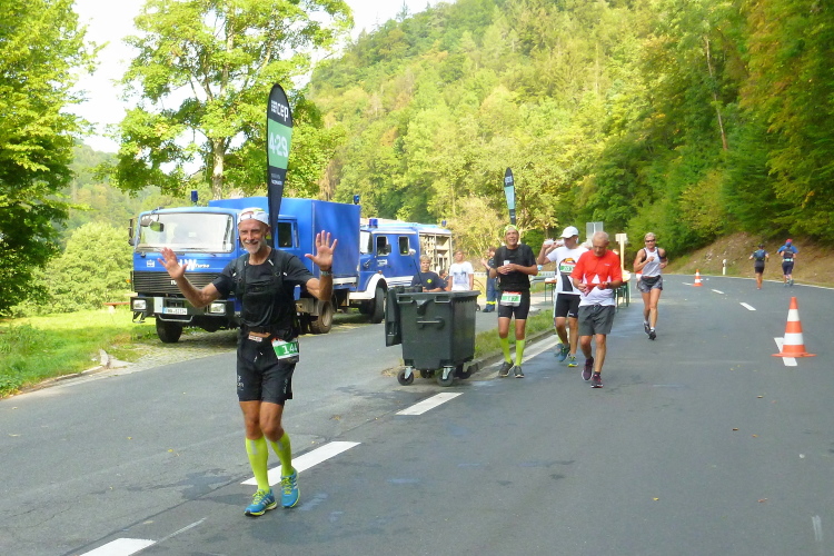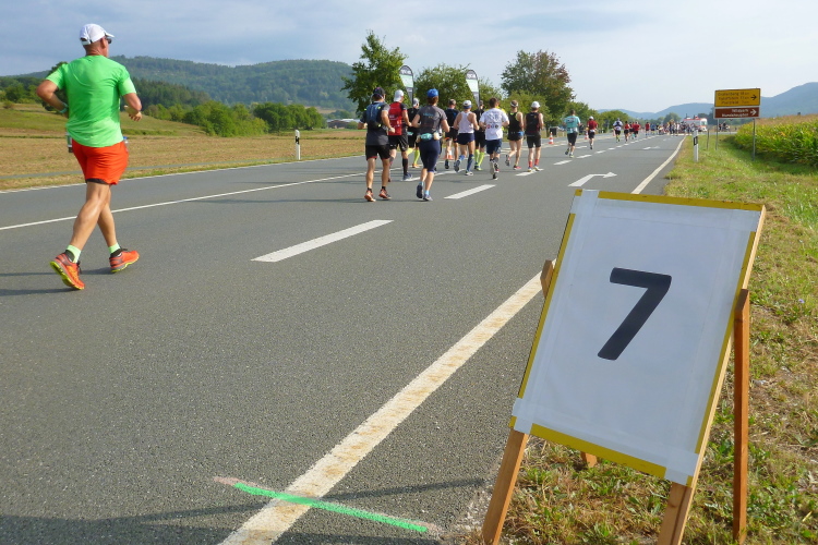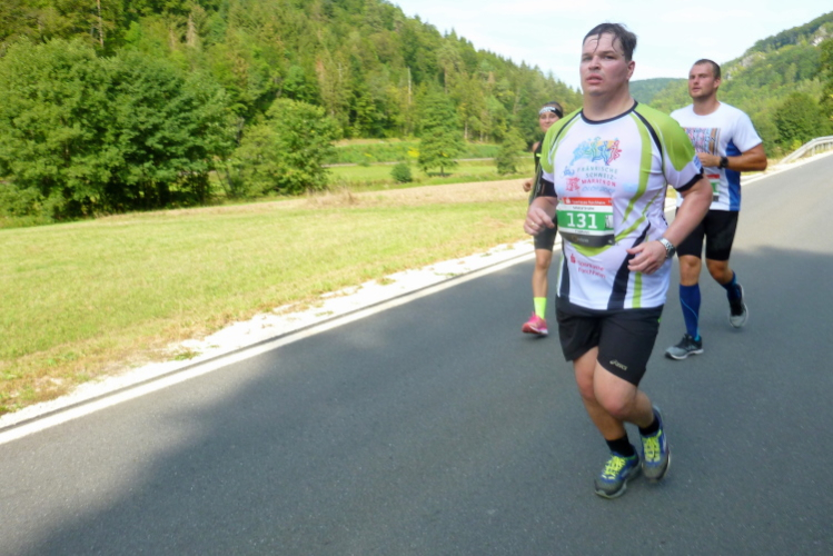 Etwa bei Kilometer 23 kommt der 4.30-Pacer auf der anderen Seite. Wir grüßen einander und klatschen uns ab. Man hilft sich gegenseitig und wünscht sich alles Gute auf dem Heimweg, der noch ein wenig dauern wird. Ich komme gut durch Muggendorf durch.
