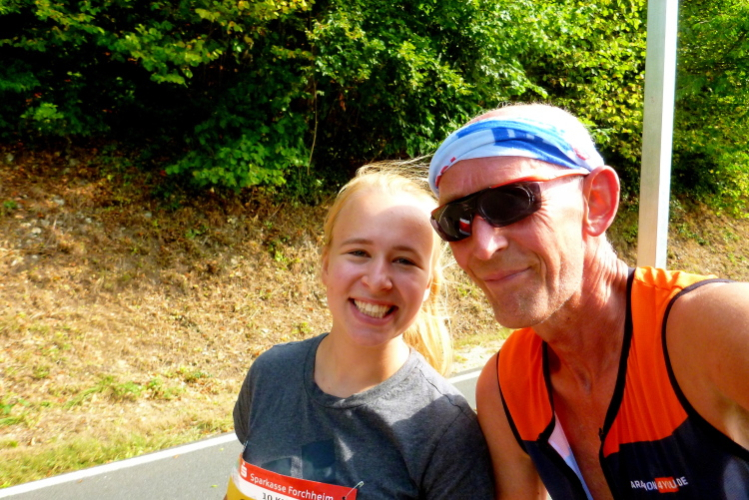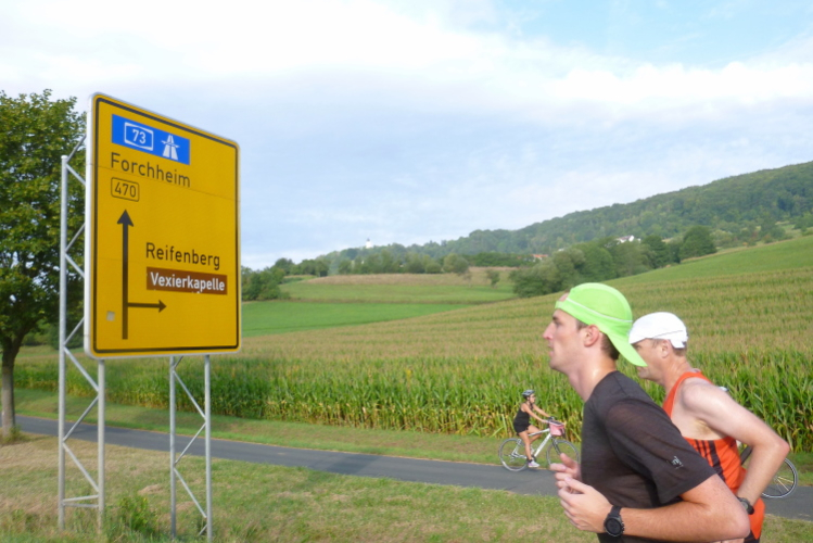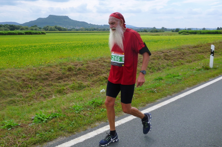 Wir erreichen bei km 5 die Wende in Weilersbach, eine Gemeinde mit rund 2000 Einwohnern. Wenn wir in Richtung Forchheim schauen, dann erkennen wir einen Höhenzug südlich der Wiesent, der sich Walberla oder die Ehrenbürg nennt. Das ist ein Zeugenberg, worauf die Walburgis-Kapelle im 14. Jahrhundert errichtet wurde. Ich habe es leider bis heute nicht geschafft, da hinaufzusteigen. Die Aussicht muss weitläufig sein. Oder vielleicht wäre das Walberla-Fest, der Patronatstag der Heiligen Walburga, am ersten Maiwochenende ein Anlass dafür? Wir wenden und laufen auf der anderen Seite zurück. Nun kann man die folgenden Läufer sehen und den einen oder anderen abklatschen. So die Lauflegende Erwin, die Pacemaker Harald und Friedrich oder den Klaus den Dänen.