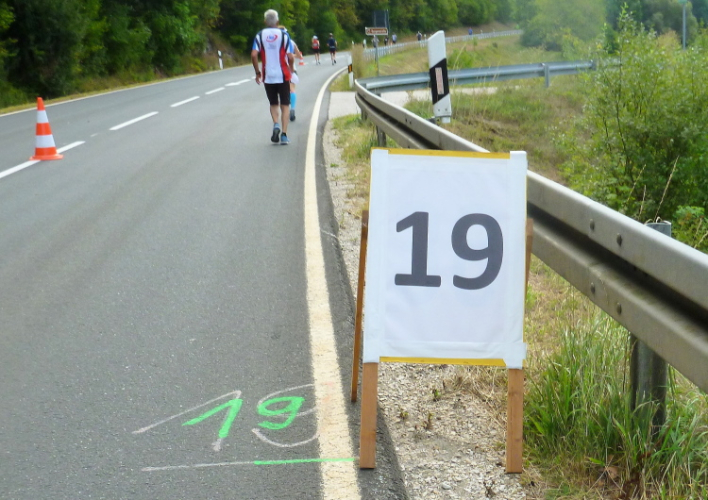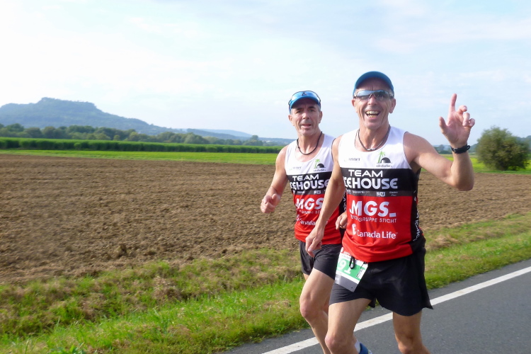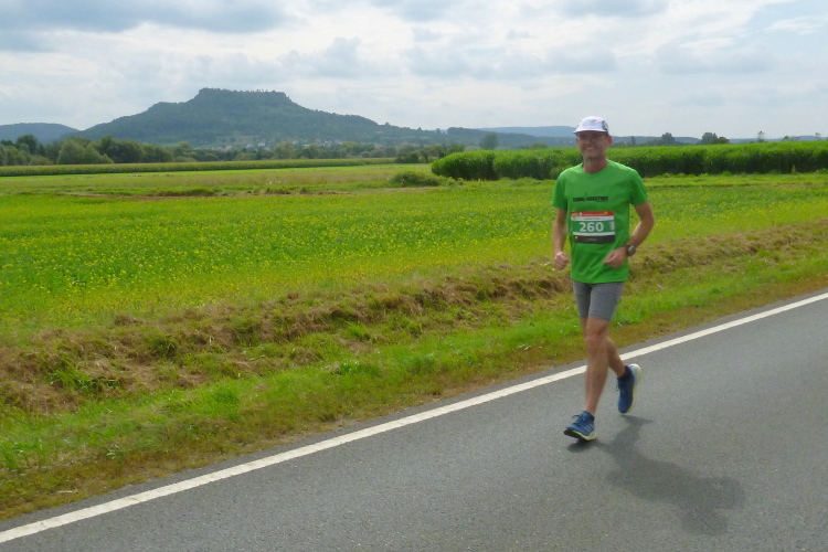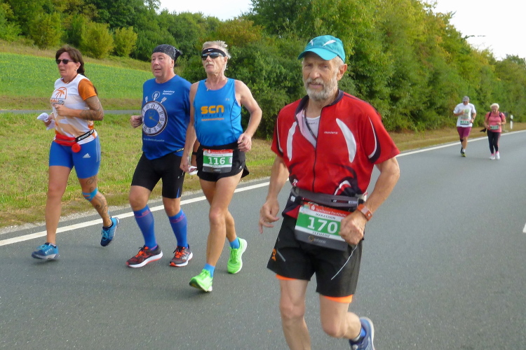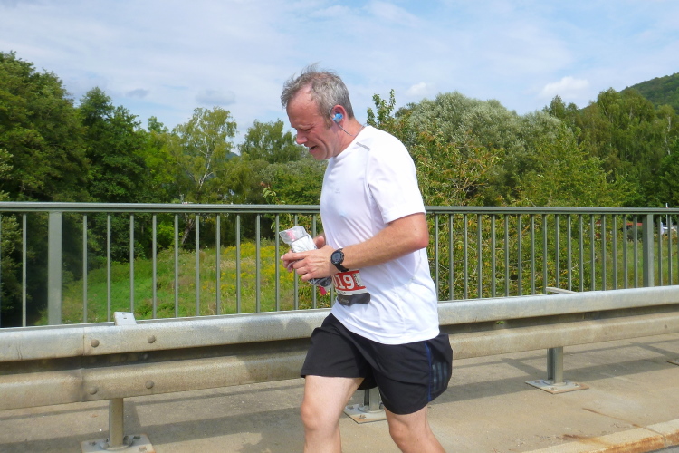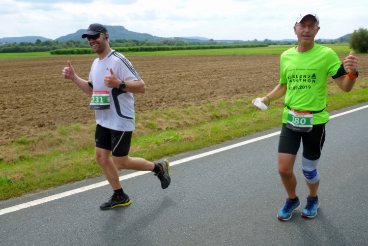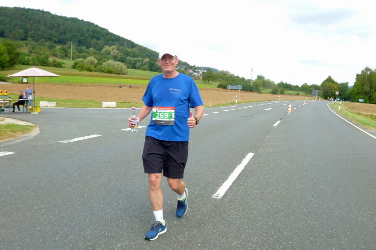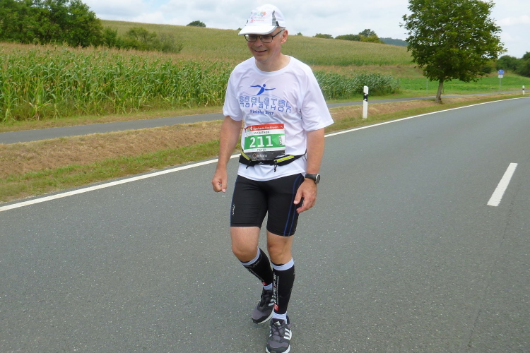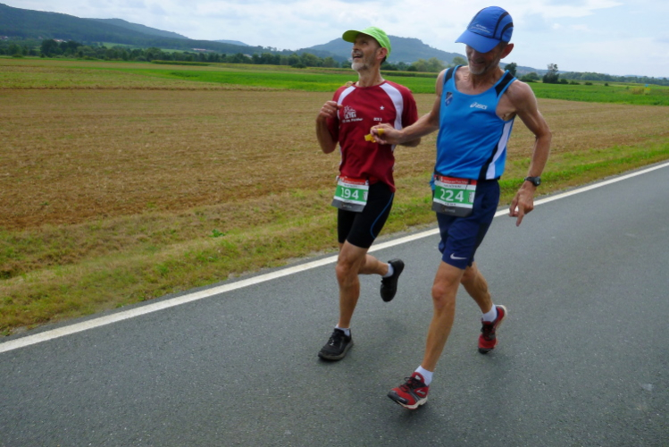 Dann sind wir voll in der Sonne, auf der anderen Seite kommen Läufer mit einer Zeit von 3.30 Stunden entgegen, die sind in wenigen Minuten fertig. Aber auch die haben Federn gelassen und sind gezeichnet. Schließlich läuft Harald mit seiner Fahne für die 4.30 Stunden auf mich auf und nimmt mich für 100, 200 Meter mit. Ich falle dann wieder in den Wanderschritt. Es wird ganz zäh bis zur Wende in Weilersbach, zumal jetzt etwas Wind von vorne kommt. Ich trinke ausgiebig und doch ist es zu wenig für den Körper.