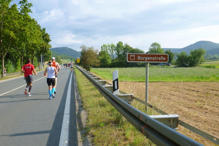 Die Bundesstraße 470 zählt in diesem Bereich zur Burgenstraße, eine ausgewiesene Strecke von Mannheim nach Bayreuth. In der Fränkischen Schweiz berührt die Ferienstraße namhafte Orte, Burgen und Schlösser wie die Kaiserpfalz in Forchheim, Egloffstein, Gößweinstein, Pottenstein, Waischenfeld bis zum Schloss Seehof bei Memmelsdorf. Es geht nun lange, aber nicht steil nach oben, die ersten marschieren. Wie der Olaf. Als ein flottes Mädel zu ihm aufschließt, lässt sich dieser nicht lumpen und trabt wieder an. Auf der Gegenseite kommen die Skater in Gruppen heruntergerauscht und lassen es rollen. Am Ende der Steigung des Gasseldorfer Berges steht ein Musikant mit seiner Quetschn und spielt uns ein Ständchen, aber wir müssen weiter.