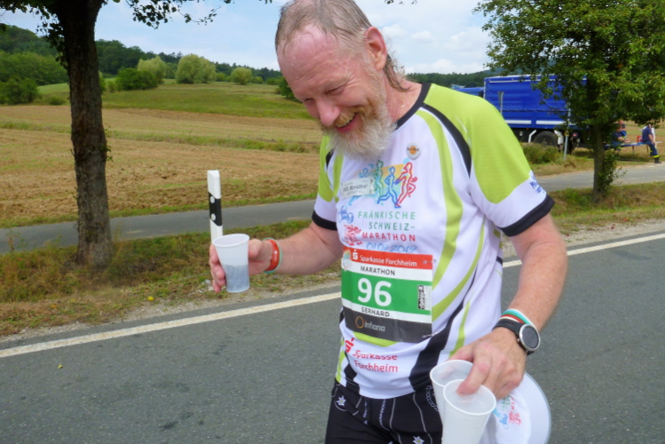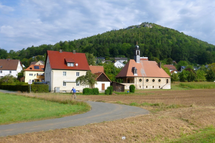 Muggendorf, der nächste Ort, ist bekannt für seine zahlreichen Tropfsteinhöhlen, wie die Rosenmüller-, Witzen- und Oswaldhöhle. Durch letztere führt sogar der Frankenweg-Trail. Ende September feiern die Muggentaler ihr Erntedank- und Kürbisfest. Trocken wird es da nicht zugehen, zumal wir in der Region mit den meistern Brauereien unterwegs sind. Hier wechseln wieder die Staffeln und verpflegen können wir auch. Was wir unbedingt benötigen, ist Erfrischung, denn die Sonne hat die Temperatur gehörig nach oben getrieben. 25 Grad wird es haben. Das Wasser ist für die Birne, Elektrolyt für den Bauch. Matthias, der Würzburger, der auch schon jahrzehntelang unterwegs ist, kommt entgegen. Er ist schon auf dem Rückweg.