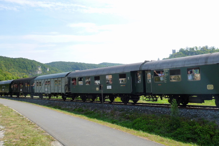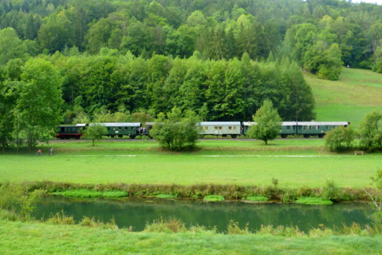 An einem einzelnen Haus sitzen drei ältere Leute im Garten und hören Rock'nRoll aus den 50er Jahren. Danny & the Juniors mit „At the Hop“ läuft gerade. Jetzt haben sie einen Wasserschlauch verlegt und in Betrieb genommen, damit können wir uns erfrischen. Die Läufer nehmen die private Erfrischung dankbar an, ich auch. Nur wenige Minuten später kommt die Dampfbahn von ihrem Endbahnhof in Gößweinstein wieder angefahren. Jetzt sehe ich sie direkt neben mir, da freut sich der Fotograf.