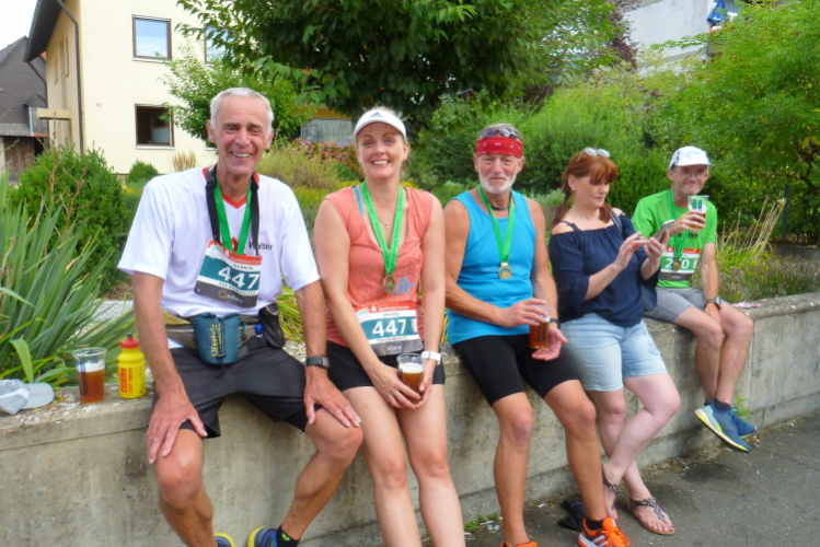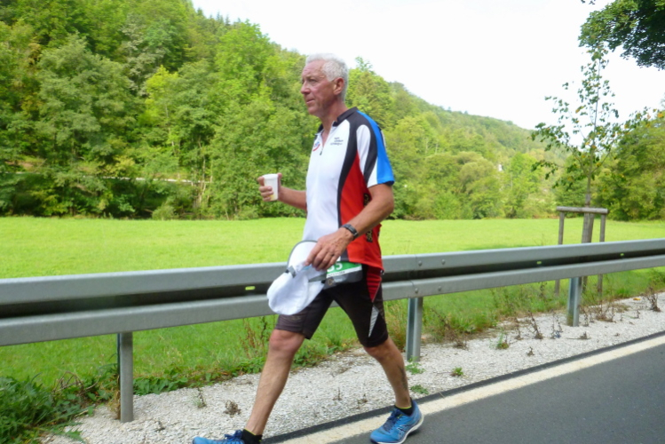 2014: Jochen Brosig, damals als Fotograf mit dem Rad unterwegs, heute als Moderator im Ziel, watschte mich sprichwörtlich ab, als ich auf seinem Gepäckträger mitfahren wollte: „Du bist alt genug zum Laufen“. Die Hitze setzt mit auf dem letzten Wegstück arg zu, Oberkellner Erwin erlöst mich im Ziel mit einem frischen Bier. 192 Finisher. 3.51.04 Stunden.