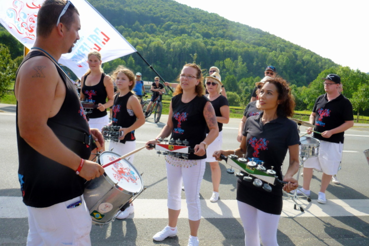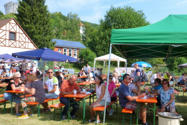 Streitberg, gleich kommt Kilometer 28, die Sambagirls sind immer noch „in action“. Für sie sind die Temperaturen brasilianisch, ihr Tanzstil auch. Nebenan sind die Biertische gut besetzt, gleich wird zum Mittag Deftiges serviert. Ich rieche Schweinebraten, mein Magen knurrt. Kurz biegen wir in den Ort hinein und an einer Linkskurve sehen wir weit oben die Streitburg.