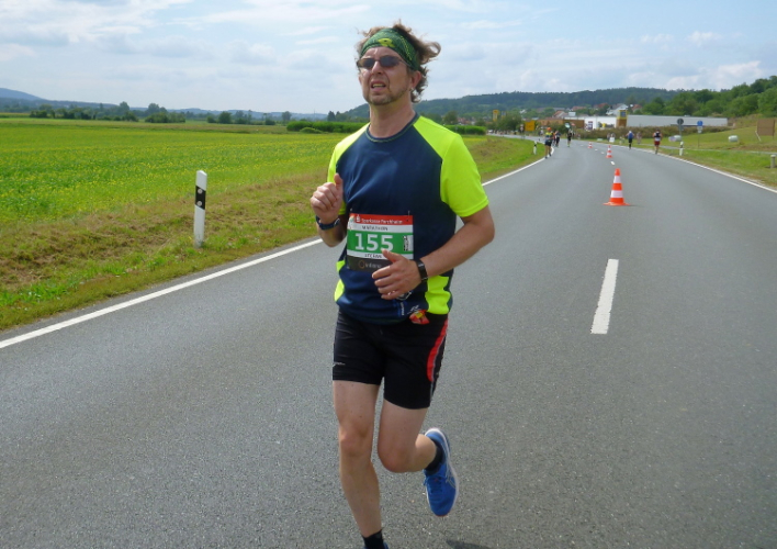 Km7, schon die dritte Möglichkeit der Versorgung, denn der Feuerwehrkamerad steht nun auf der anderen Seite der Straße mit seinem gefüllten Getränkebecher. So kann es weitergehen. Ich komme mit Gunar aus Erfurt ins Reden. Er meint, mich schon ein paar Mal gesehen zu haben, kann aber mich nicht einordnen. Erst als ich mich als laufender Reporter oute, fällt bei ihm der Groschen. Ich solle in seiner Heimat den Erfurt Marathon laufen, es würde sich lohnen. Aber der Kurs ist wellig und heiß ist es auch meistens. Nun ja, kühl ist es heute auch nicht und der Schweiß fließt bei den meisten schon jetzt in Strömen. Schatten findet man auf diesem Pendelstück nicht.