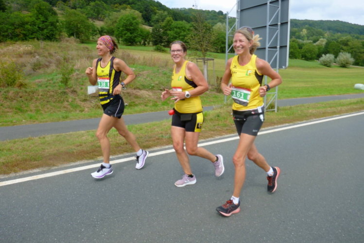 Nur mehr fünf Kilometer. Nach wenigen Metern holt mich ein Damentrio des TF Feuerbach ein, die Mädels ziehen vorbei. Sie ratschen auch noch und haben beste Laune. Ein wenig kann ich mich dranhängen. Auf der anderen Seite kommen nur noch wenige Marathonis entgegen, sie haben Riesenabstände zueinander. Der Alex läuft sogar barfuß, ihn macht lediglich der raue Asphalt zu schaffen, dass der Boden auch heiß sein kann, darüber verlautet er nichts.