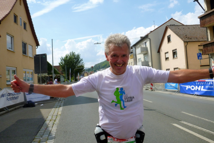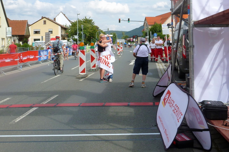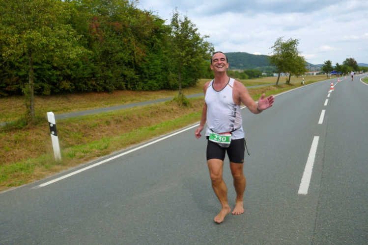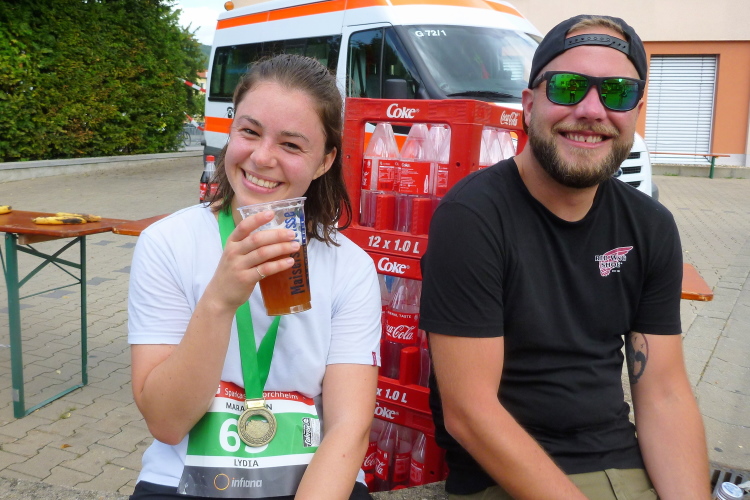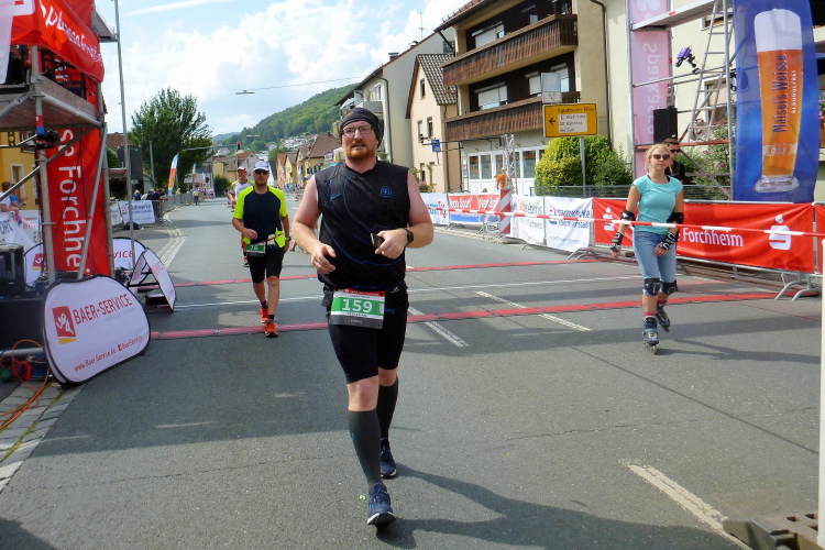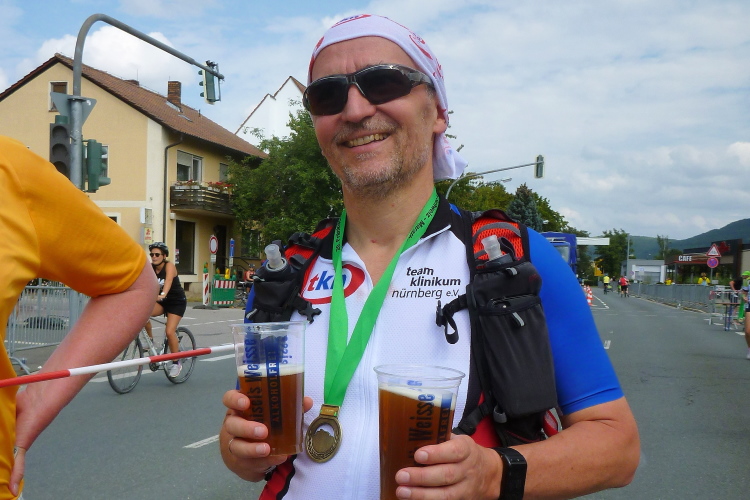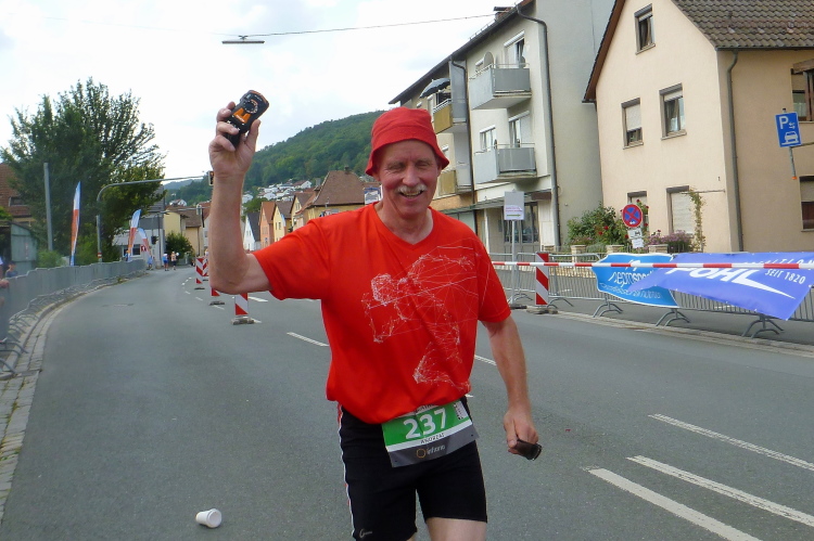 Es geht nach Ebermannstadt hinein, der letzte Kilometer, nochmals kurz marschieren und dann reiße ich mich am Riemen und trabe an. Die Leute applaudieren freudig und nach gut 4.43 Stunden laufe ich unter dem Zielbanner hindurch. Michael klatscht mich ab und schickt den durstigen Autor gleich zum Tränke, wo es das alkfreie Weißbier aus Bayreuth gibt.