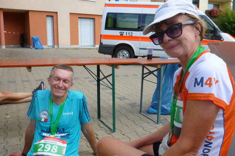 Nicht lange halte ich mich dort auf. Ich wechsele noch ein paar Worte mit Reporterkollege Andreas, der heute zum Gedenken an den Überfall der Deutschen auf Polen vor 80 Jahren sein Finishershirt vom Warschau Marathon angezogen hat. Außerdem hat er heute seinen 150. Marathon geschafft. Seine „Madam“ Judith war noch etwas besser, denn sie landet in ihrer Klasse ganz oben auf dem Stockerl. Glückwunsch. Im Ziel lasse ich mir die Nudeln schmecken. Trotz der Qual hat es mir wieder sehr gut gefallen.