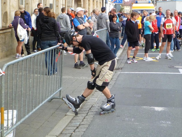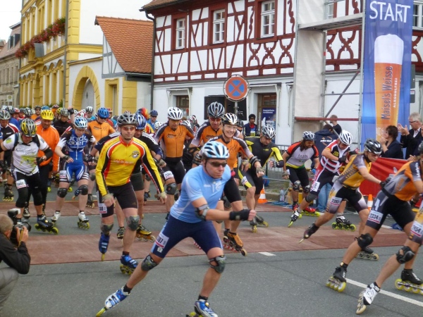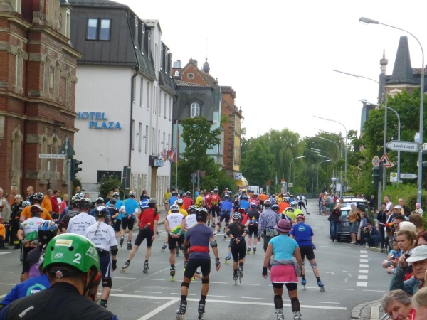 Dann folgen einige Gruppen Skater, anfangs diejenigen, die lizenziert und so entsprechend schneller sind als die Fitness-Kategorie, die im Minutenabstand folgen. In der letzten Gruppe der blinden und sehbehinderten Skater werden die Deutschen Meisterschaften ausgefahren. Nicht vorstellbar, was da zum Beispiel ein Blinder an der Hand eines Begleitläufer leisten muss. Eine fehlerfreie Zusammenarbeit ist da unabdingbar.