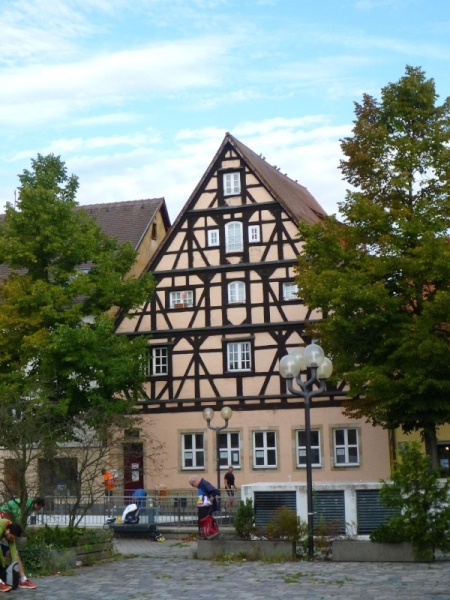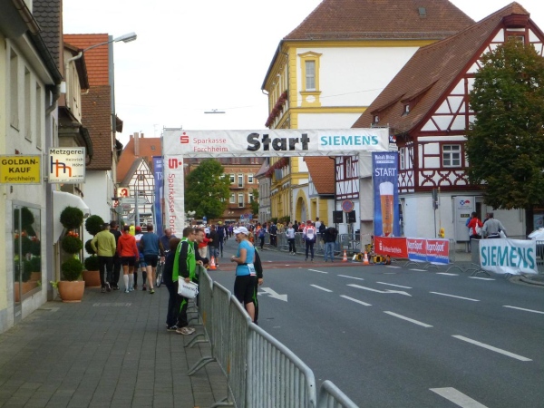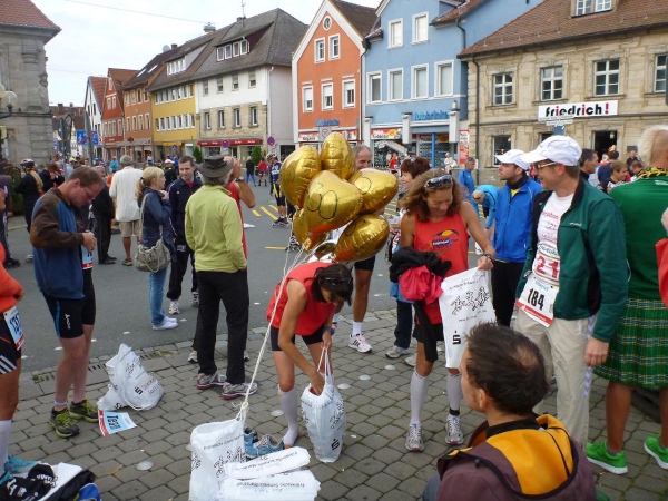 Parkplätze sind in der Umgebung von Ebermannstadt genügend vorhanden. Ich finde einen in der Nähe des Bahnhofes und bin innerhalb fünf Minuten in der Ortsmitte. Im Hotel Sonne unweit des Marktplatzes können im Saal die Unterlagen unter Vorlage der Meldebestätigung empfangen werden. Einige Hinweisschilder sind angebracht, aber die braucht es nicht, denn du musst nur dem Läuferfeld hinterher marschieren. Am Kirchenplatz stehen schon die Transferbusse bereit, die die Sportler zum Startort nach Forchheim bringen werden.