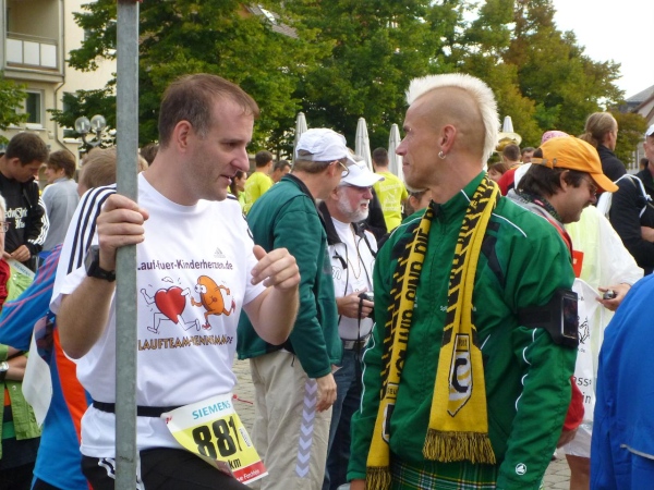 Thomas Schmidtkonz läuft mit über den Weg. „Immer wenn du mit der Kamera vorbeiläufst, muss ich meinen Bauch einziehen“, so begrüßt er mich. Er und seine Freunde vom Team Bittel haben die Aufgabe der Zug- und Bremsläufer übernommen. Erwin Bittel, der informelle Häuptling der Truppe, wird dabei die schnelle 3.30-Stunden Gruppe übernehmen. Genußläufer Thomas wird die fünf Stunden abdecken. Und wenn sich jemand den routinierten Läufern anschließen will, von 3.30 bis fünf Stunden bieten diese sieben verschieden schnelle Pace-Zeiten an.