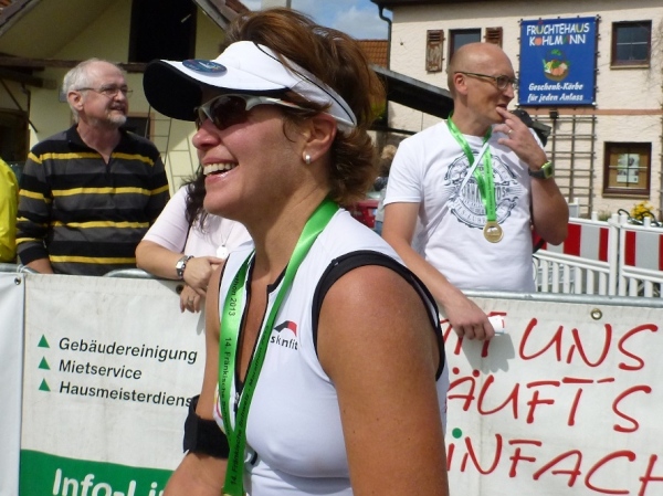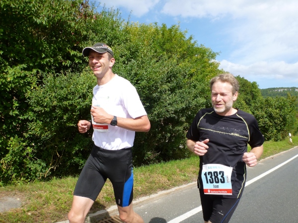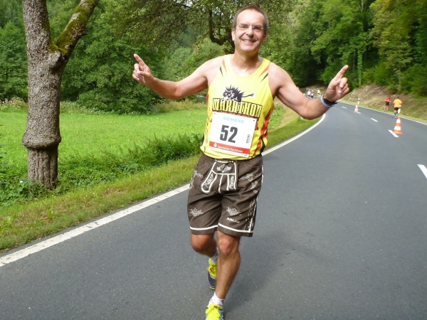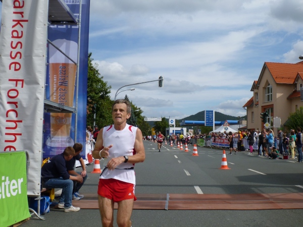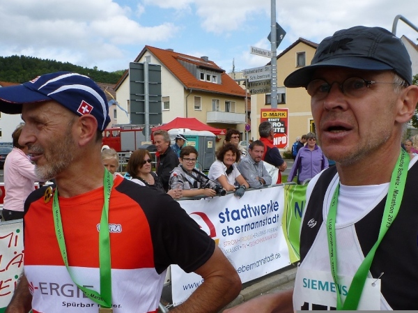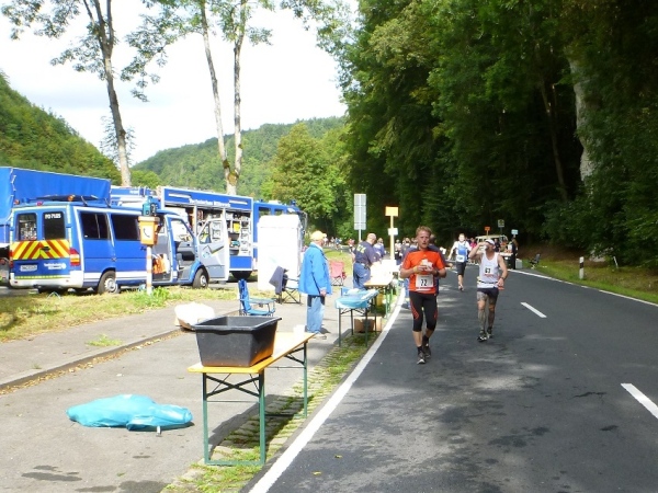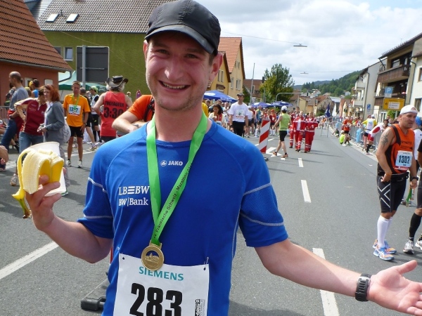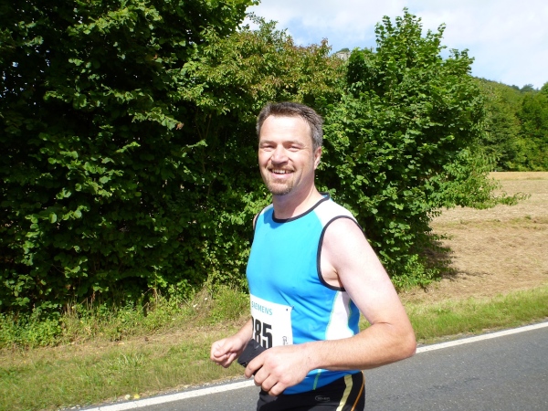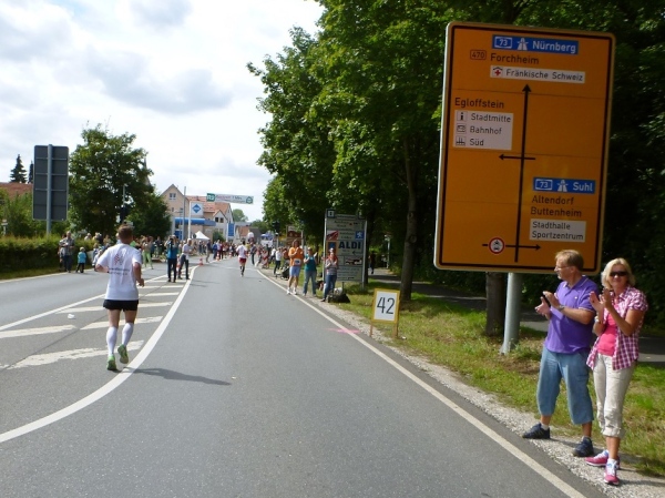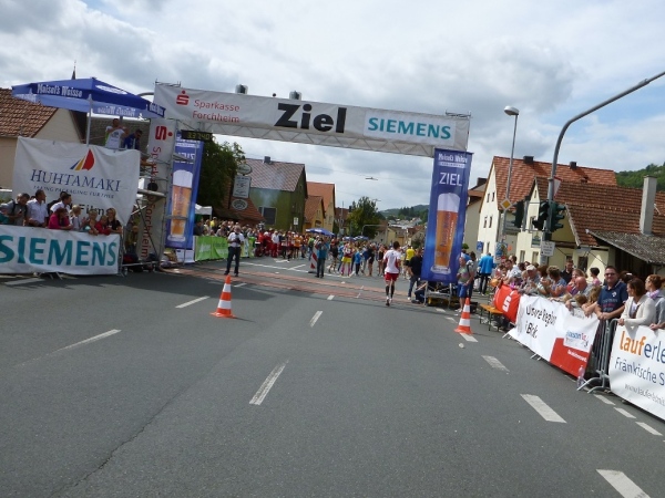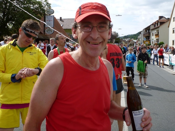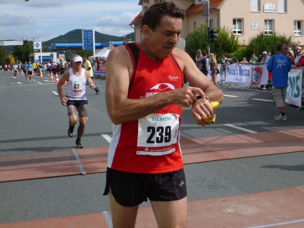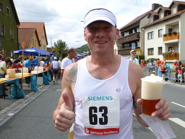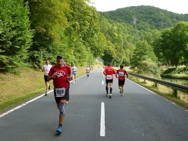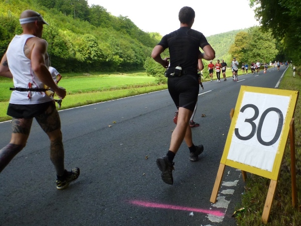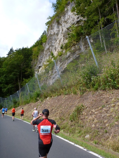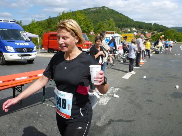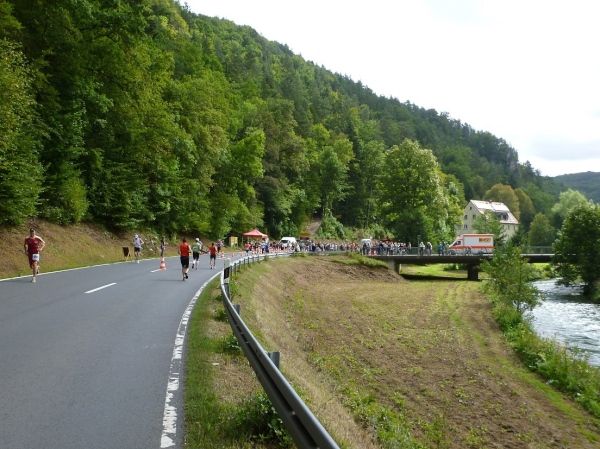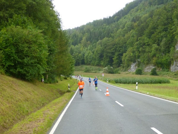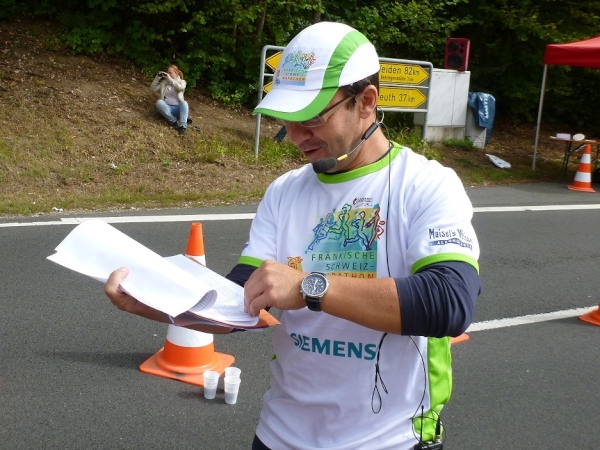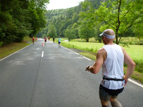 Ein, zwei Teamläufer kommen von hinten, mehr sind es nicht. Es macht Spaß am Ende loszulegen. Die letzten zwei Gegenanstiege ziehen sich noch hin. Dazwischen kann man an der letzten V-Stelle bei Kilometer 40 auftanken. Das Super (Bier) ist da nicht vorhanden, so dass ich ohne Stopp mein Tempo hoch halte und es fast in Schussfahrt Richtung Ebermannstadt rollen lasse. Und dann geht es durch das Ziel, ich bin voll zufrieden, denn ich erkenne eine 3.37 Stunden. Das passt.